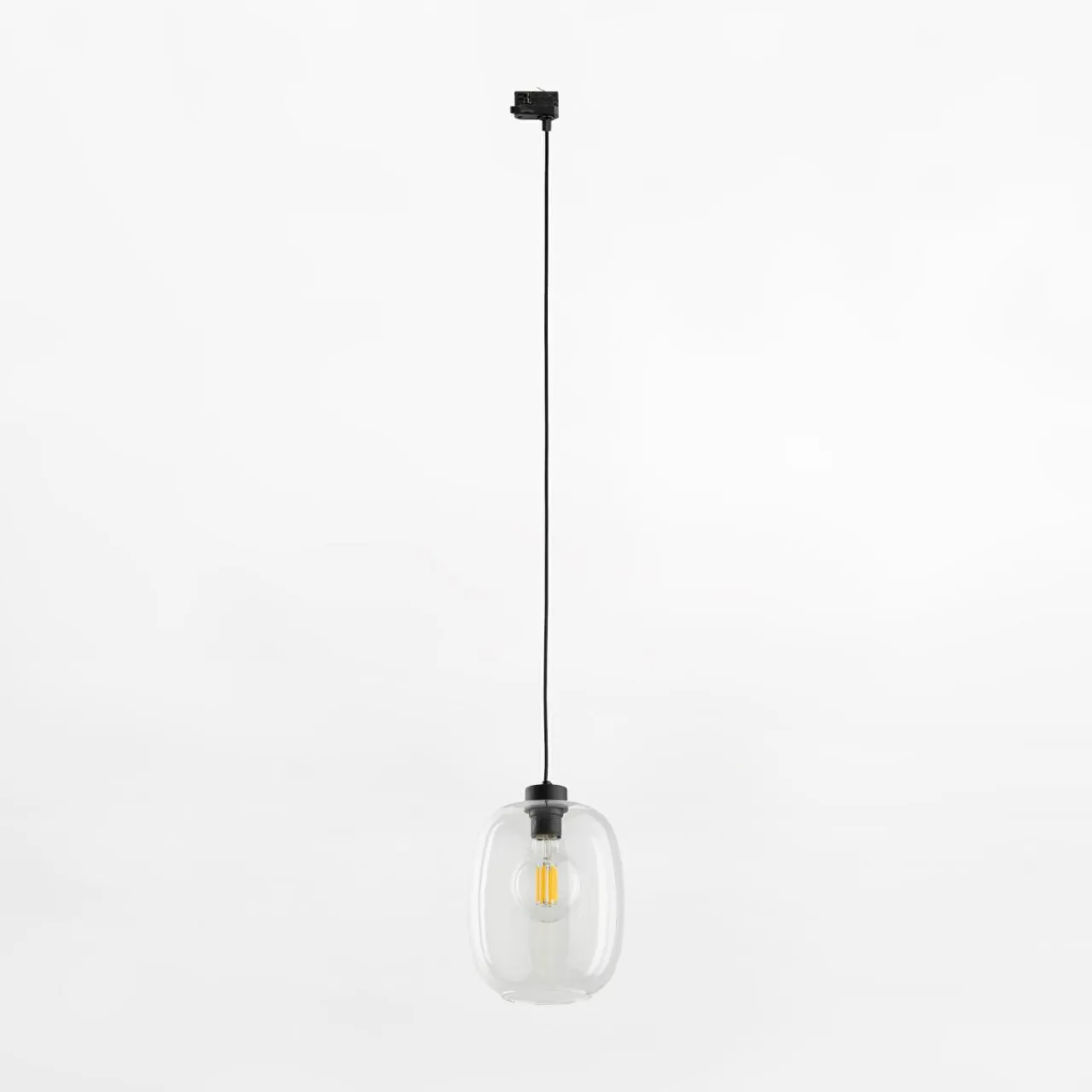 - Górna część oprawy i mocowanie do szyny są w czarnym, matowym kolorze. Dolna posiada transparentny, lekko dekorowany klosz, który mieści 1 żarówkę typu E27.