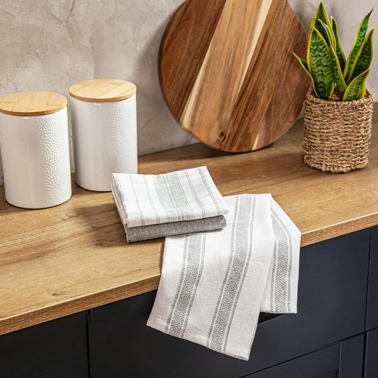Komplet 3 ręczników kuchennych sprawdzi się podczas codziennego gotowania. Bawełniana tkanina dobrze pochłania wilgoć, dzięki czemu utrzymasz porządek na blacie i w czasie przygotowywania posiłku.