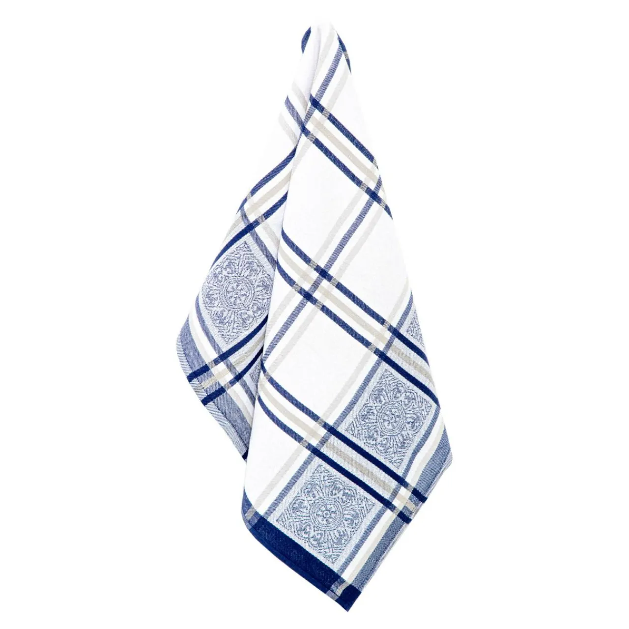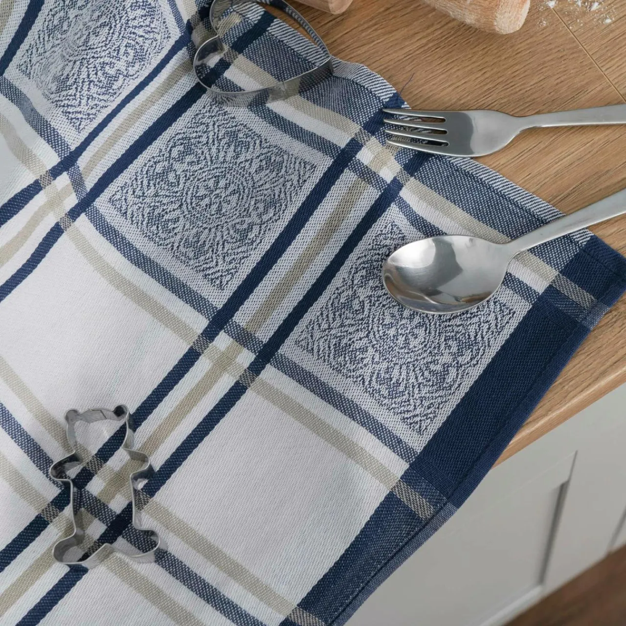 Ścierka kuchenna MAJOLICA wykonana w 100% z bawełny to doskonały wybór! Granatowe pasy wzbogacone o ciekawy wzór sprawiają, że całość prezentuje się niezwykle efektownie i staje się ozdobą pomieszczenia.