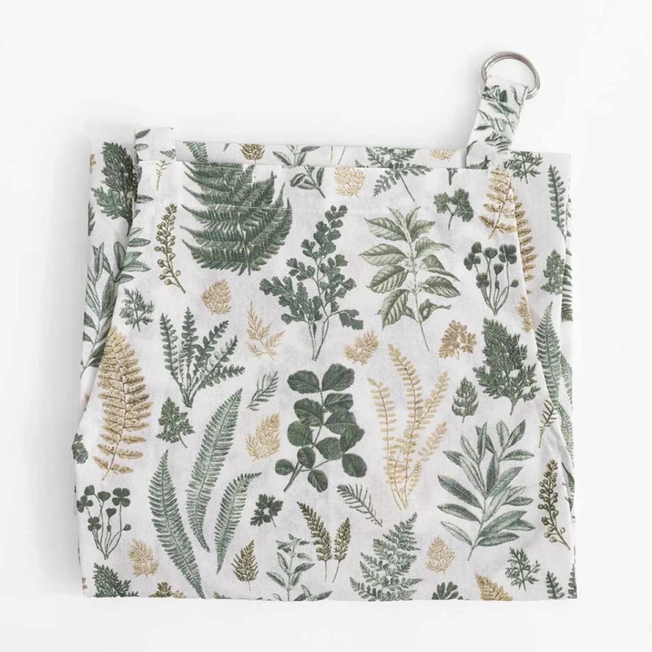 Fartuch kuchenny o białym kolorze ozdobiony roślinnym motywem paprotek to elegancka i subtelna propozycja do każdej kuchni.