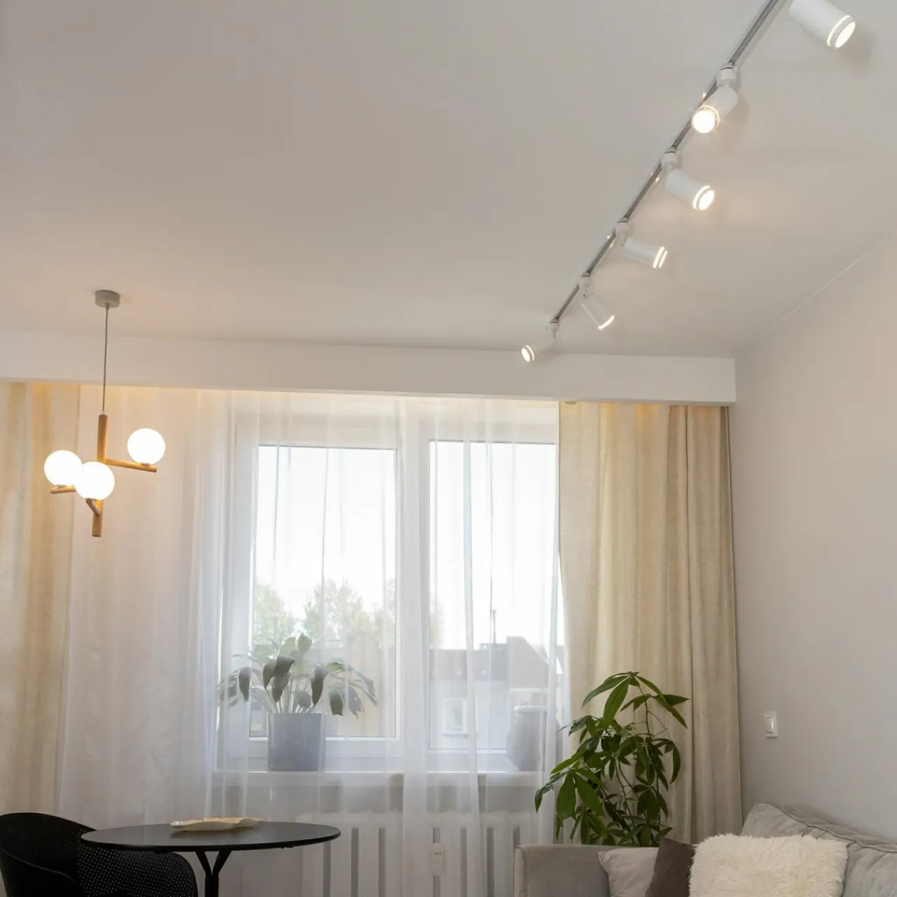 - Górna część oprawy i mocowanie do szyny są w białym, matowym kolorze. Głowica z pierścieniem zapewnia dekoracyjny efekt po zapaleniu światła.