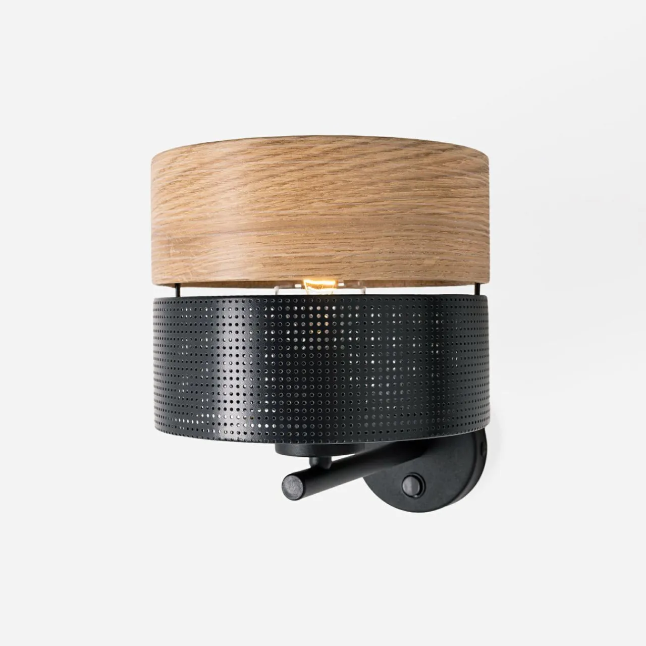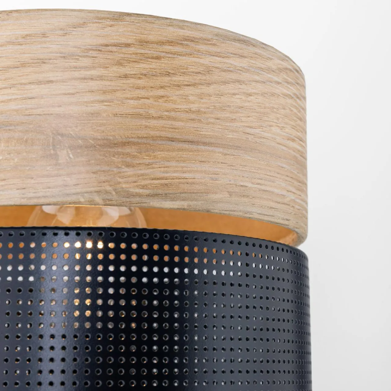 Specjalnie dobrany do lampy abażur składa się z 2 części. Górna jest jasna w kolorze naturalnego drewna natomiast dolna – czarna i matowa.