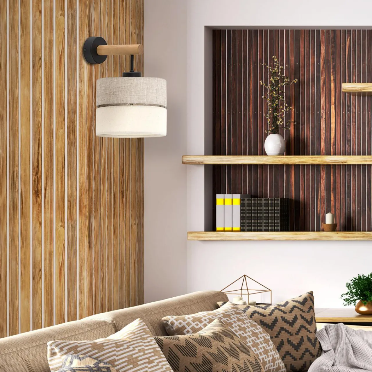 - Kinkiet ECO doskonale odnajdzie się we wnętrzu salonu i sypialni, w przedpokoju i gabinecie. Znajdzie wspólny mianownik z materiałami, które kojarzą się z naturą, jak: drewno, kamień, wiklina, czy rattan. Lubi również towarzystwo roślin doniczkowych i eksperymentów ze ścianą zieleni.