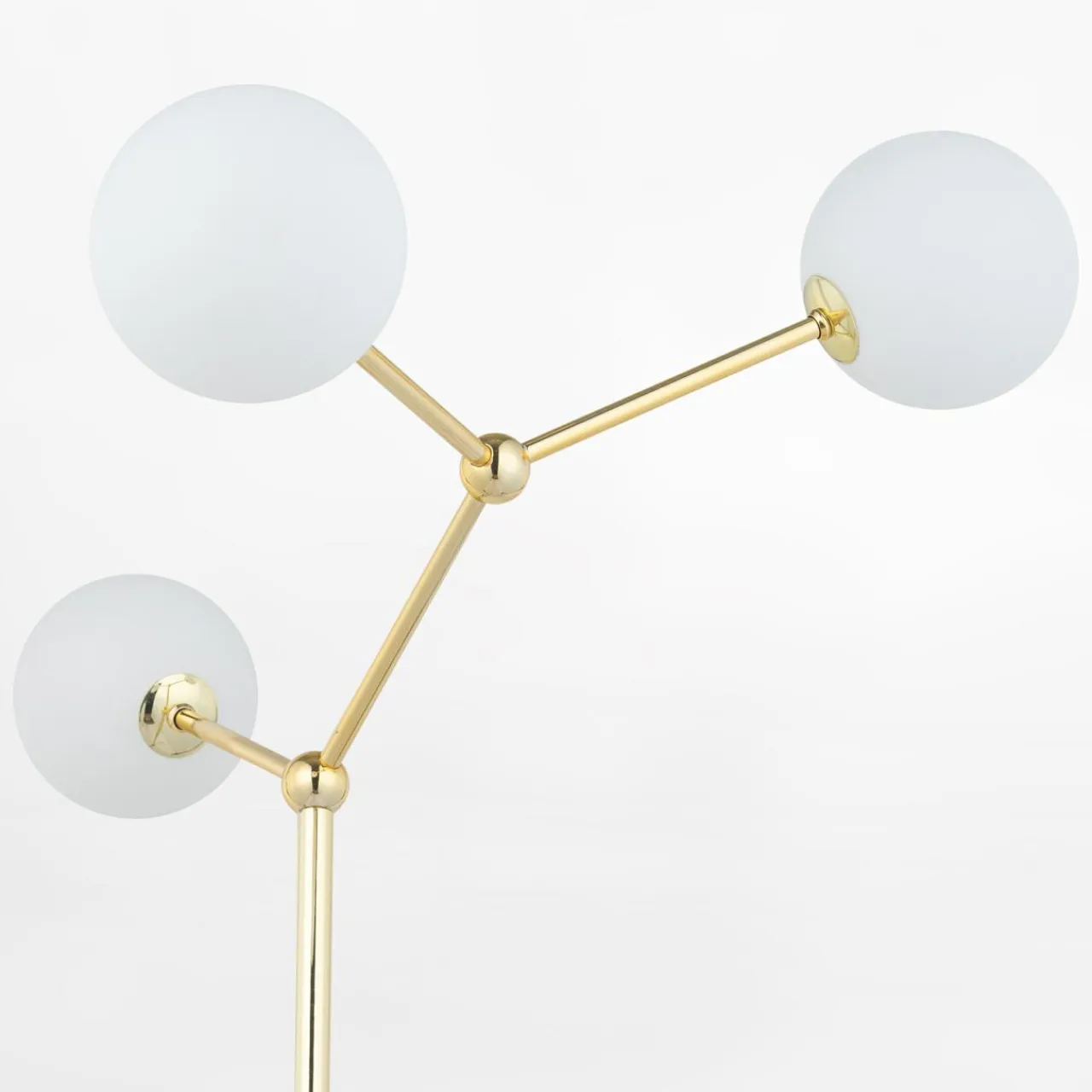 - Prosty stelaż w złotym kolorze oraz 3 białe, kuliste klosze rozjaśnią i ocieplą wizualnie wnętrze.