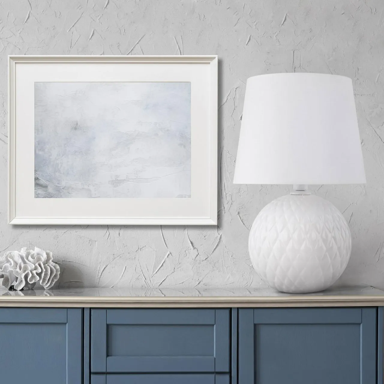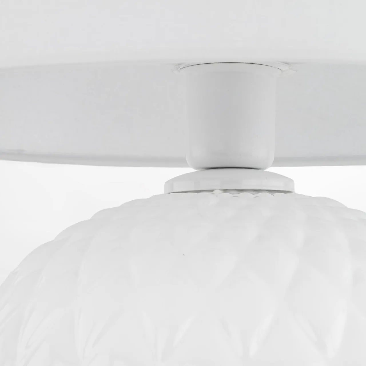 Podstawa lampy SANTANA jest kulista, ze wzorem w romby. Wykonana została ze szkła z białym, lakierowanym wykończeniem przy oprawie żarówki.