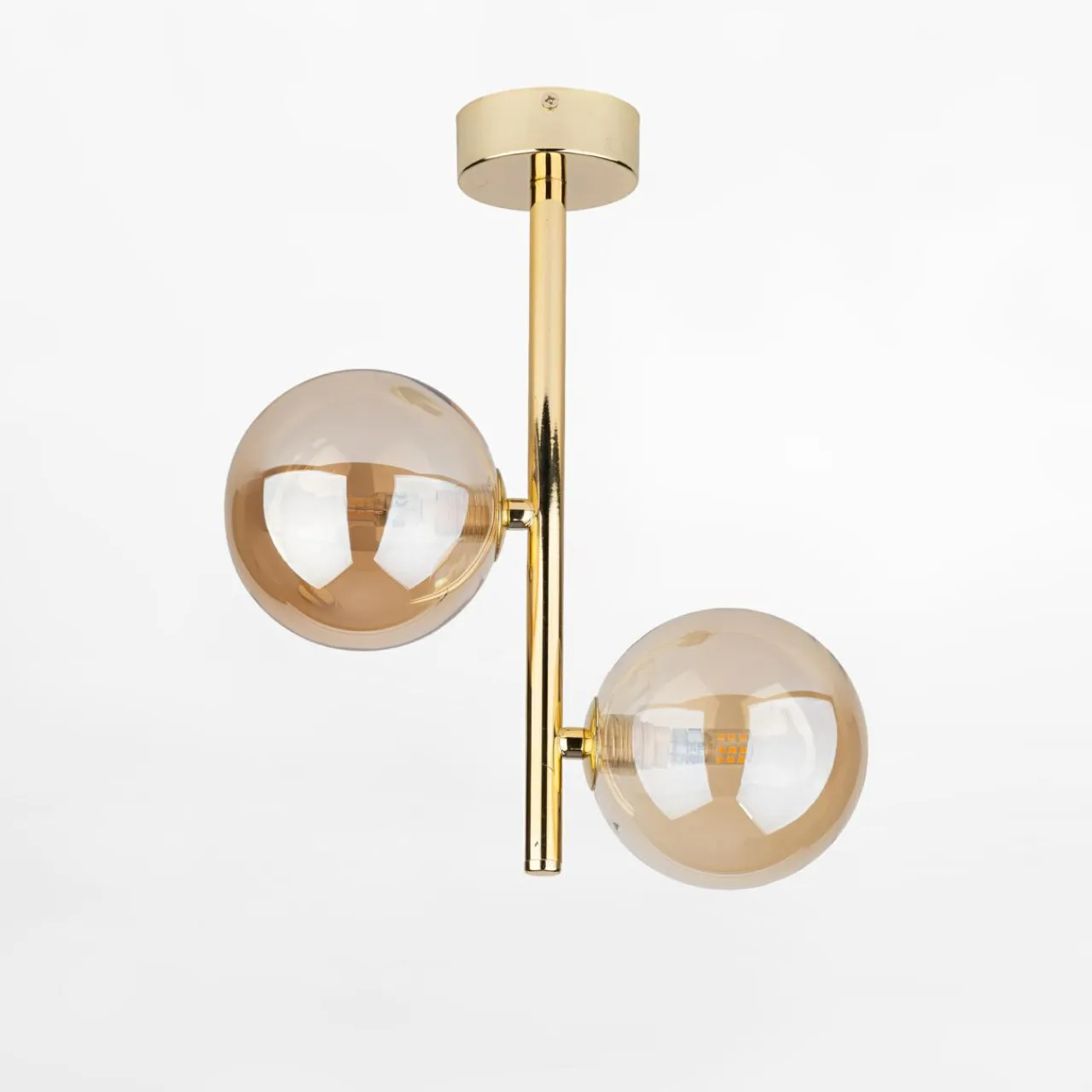 2 żarówki otoczone kulistymi kloszami doskonale oświetlą pomieszczenie, a złoty kolor wykończenia sprawdzi się we wnętrzach w aranżacji nowoczesnej lub glamour.