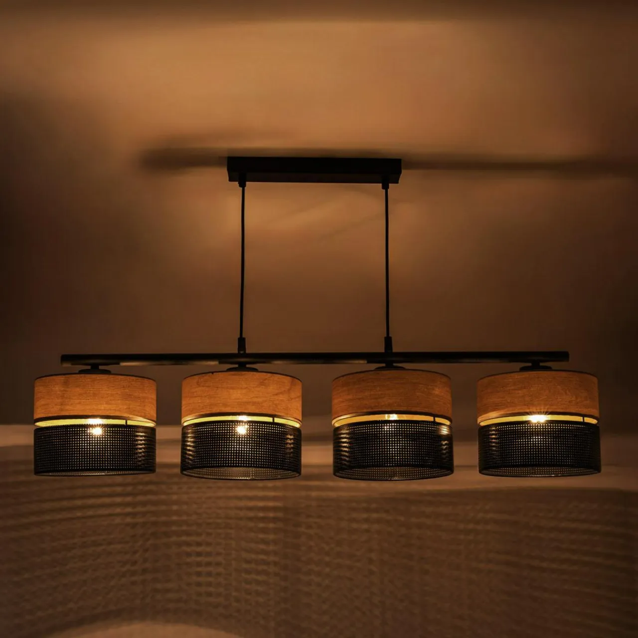 Poczwórny model lampy został zawieszony na listwie, do której przymocowane są 4 zawieszone szeregowo abażury.