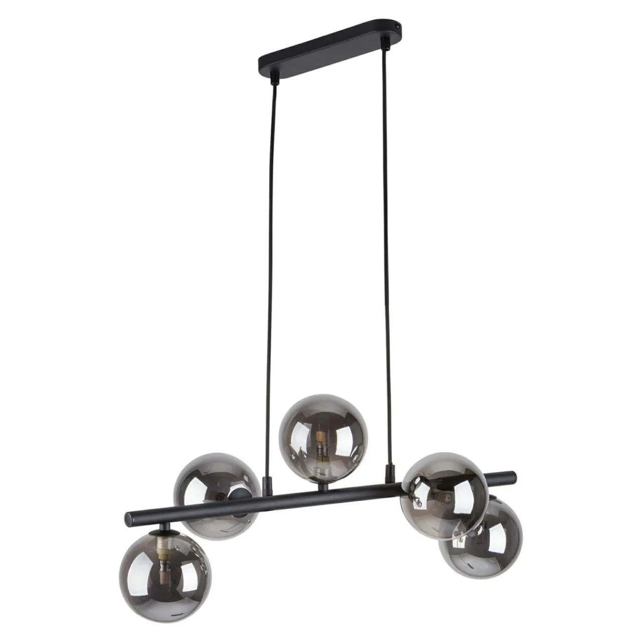 Kuliste klosze osadzone na prostej, metalowej listwie są transparentne i lekko przydymione. Wykończenie w czarnym kolorze jest dopełnieniem dla salonu utrzymanego w nowoczesnej estetyce. Komponuje się bielą, szarością oraz szkłem i chromem.