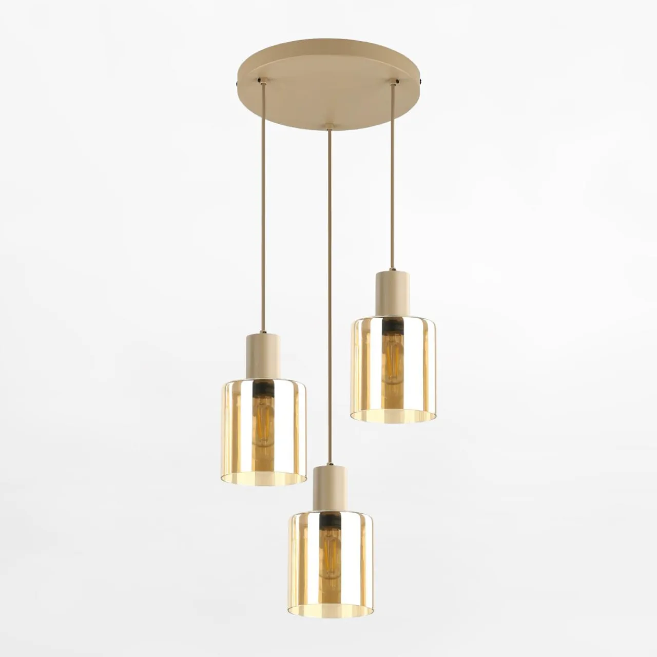 - Całości dopełniają koncentrycznie zawieszone szklane klosze z bursztynowym wykończeniem.