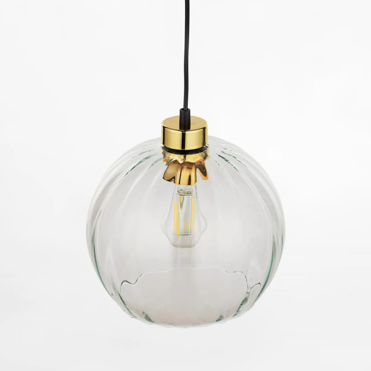 - Szkło klosza lampy DEVI jest transparentne, z lekkim wzorem, pozwala dostrzec kształt żarówki, która znajduje się w jego wnętrzu.