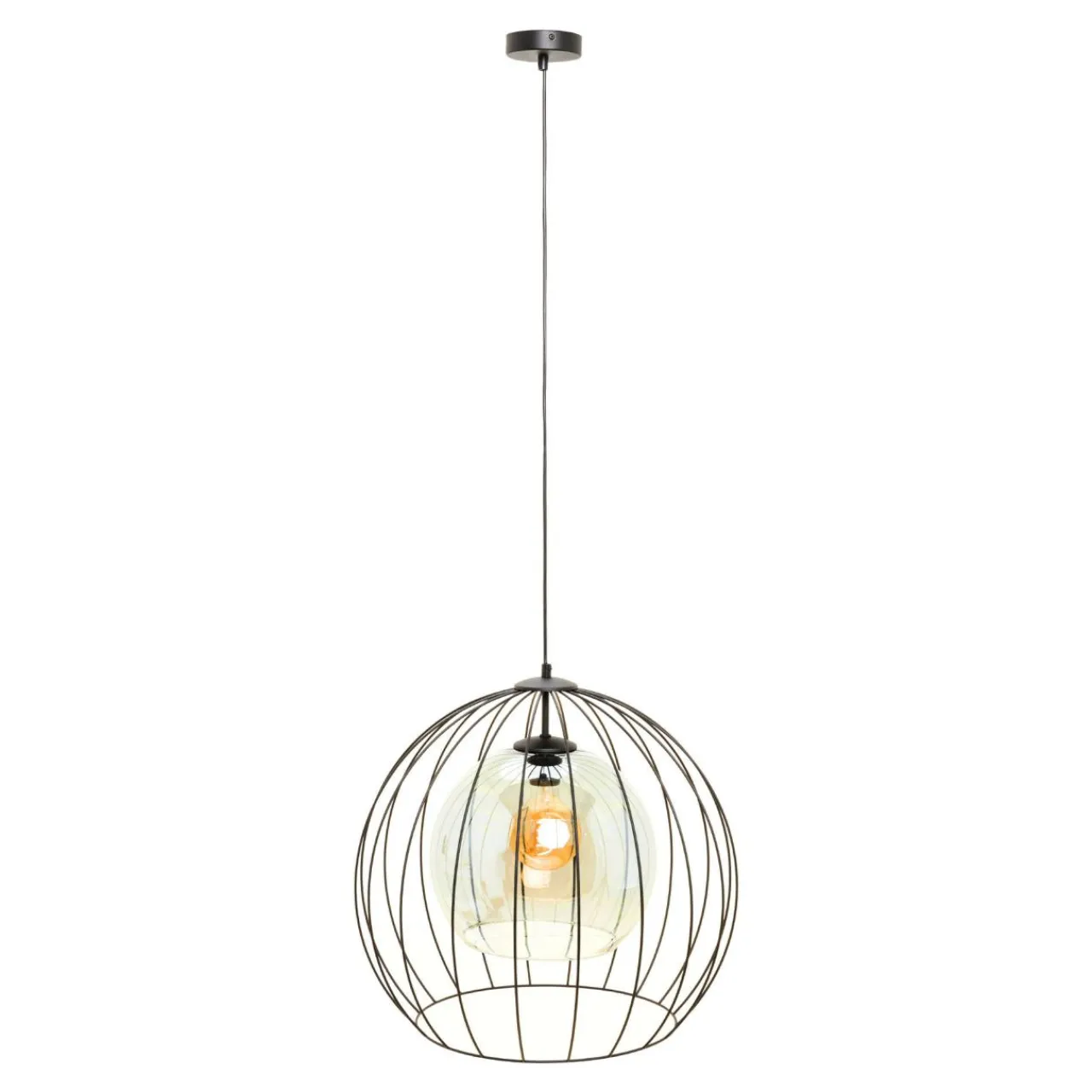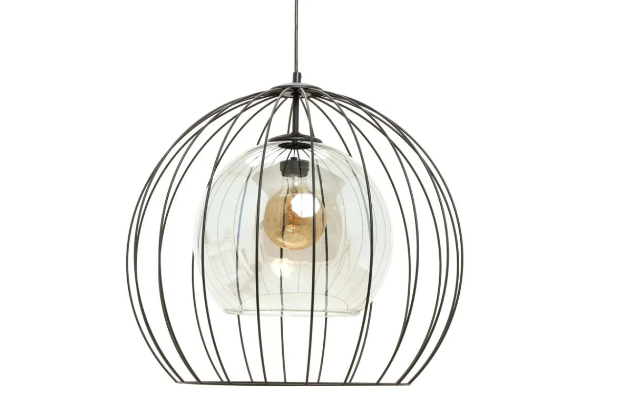 Czarne wykończenie klosza i podsufitki w ciekawy sposób kontrastuje z transparentnym szkłem klosza lampy, który pozwala na eksperyment z kształtem oraz kolorem żarówki oraz emitowanego przez nią światła.