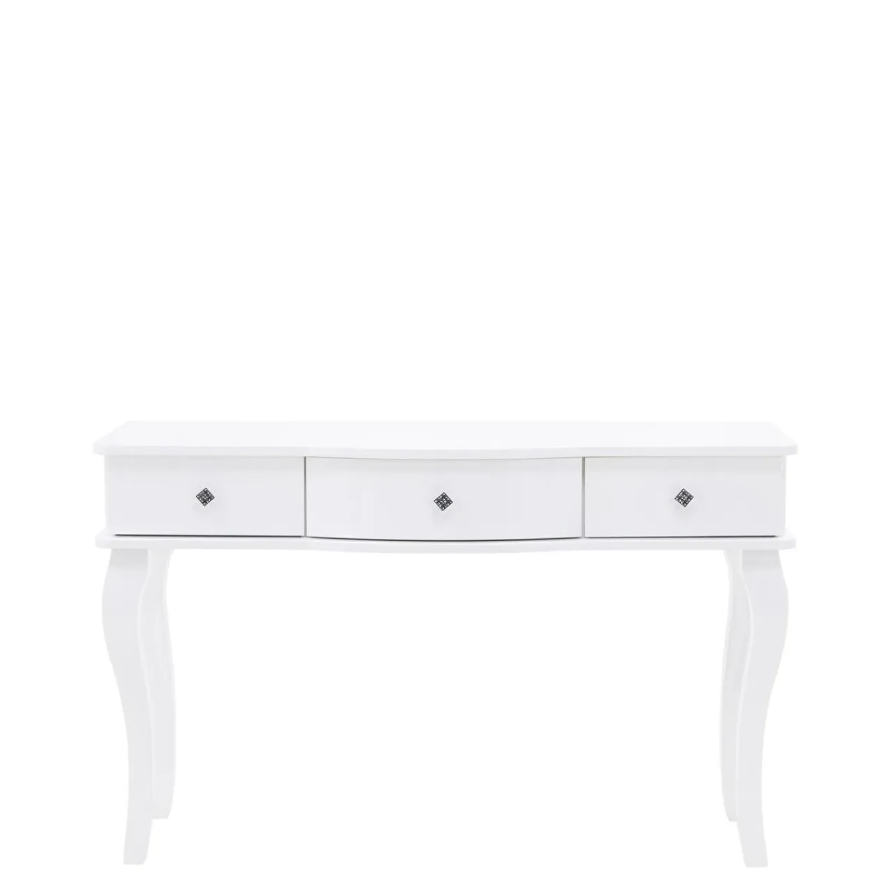 Toaletka została wykończona białym lakierem w wysokim połysku, ozdobne nóżki są wykonane z litego drewna, uchwyt jest zdobiony kryształkami.
