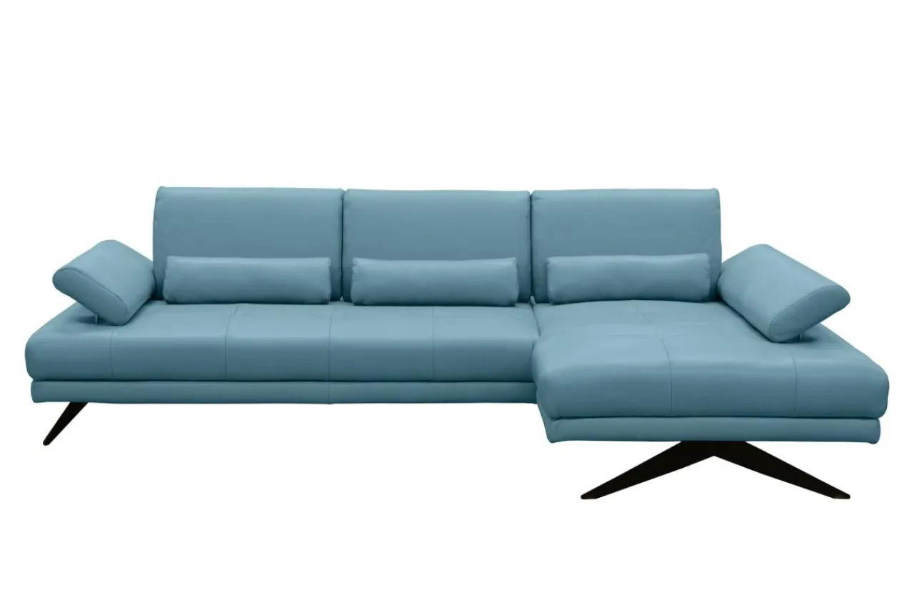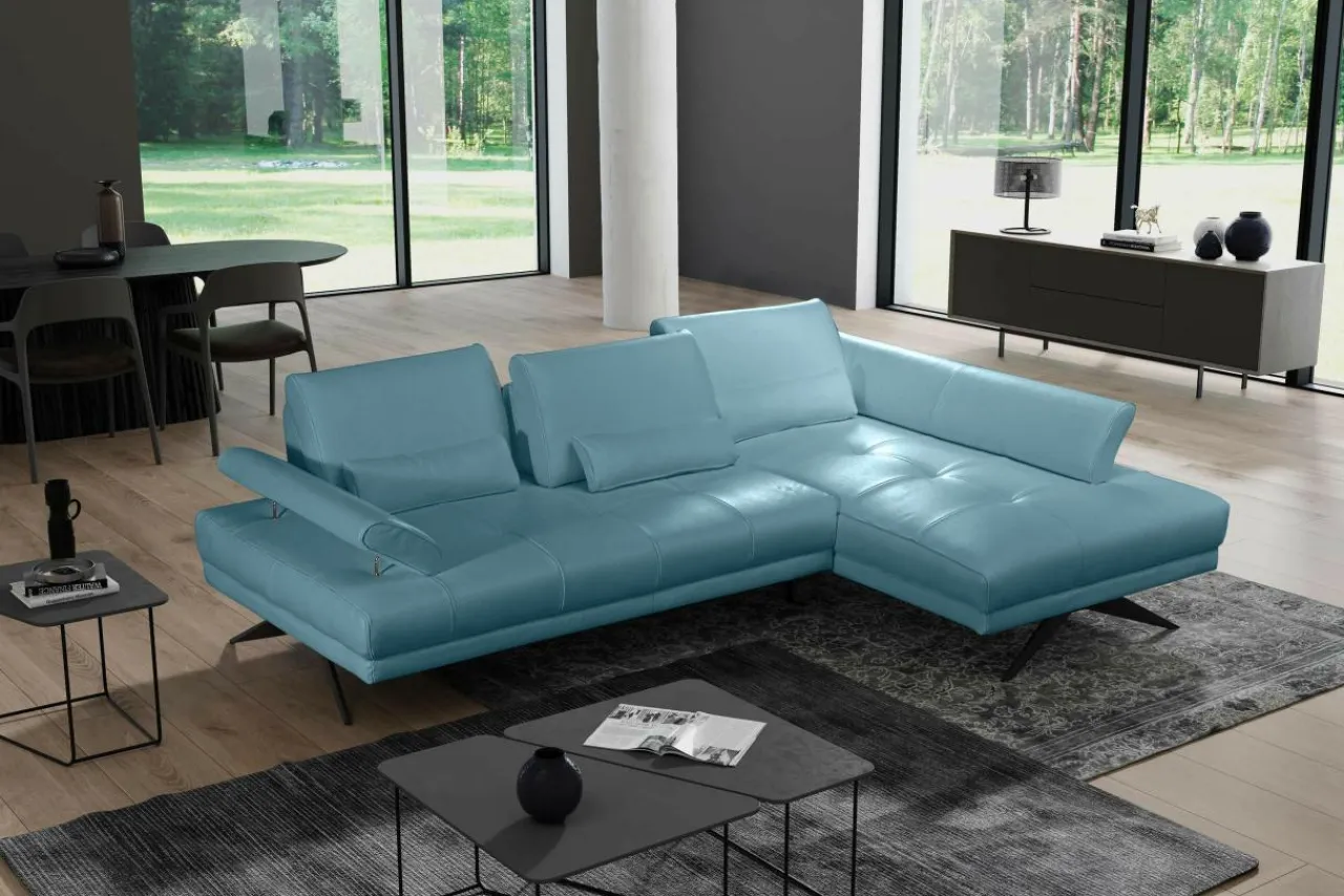 Wykończenie skórą naturalną to prestiż i elegancja. Narożnik LAZUR dodatkowo zaskakuje nietypową – niebieską barwą.
