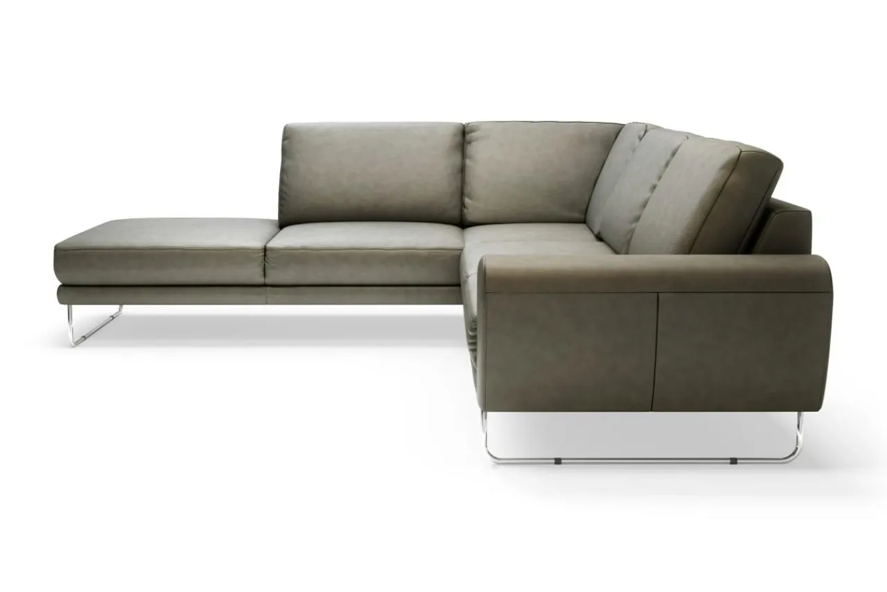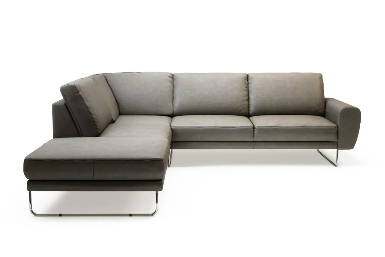 Narożnik SPRING został wykończony skórą naturalną NATUR w szarym odcieniu. Zachwyca jasnym – niejednolitym wykończeniem.