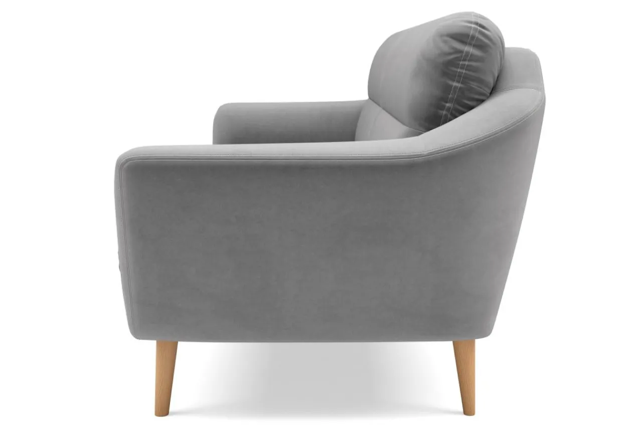 Wąskie podłokietniki zwiększają powierzchnię użytkową, a wysokie nóżki nadają bryle lekkości i ułatwiają utrzymanie czystości pod meblem.