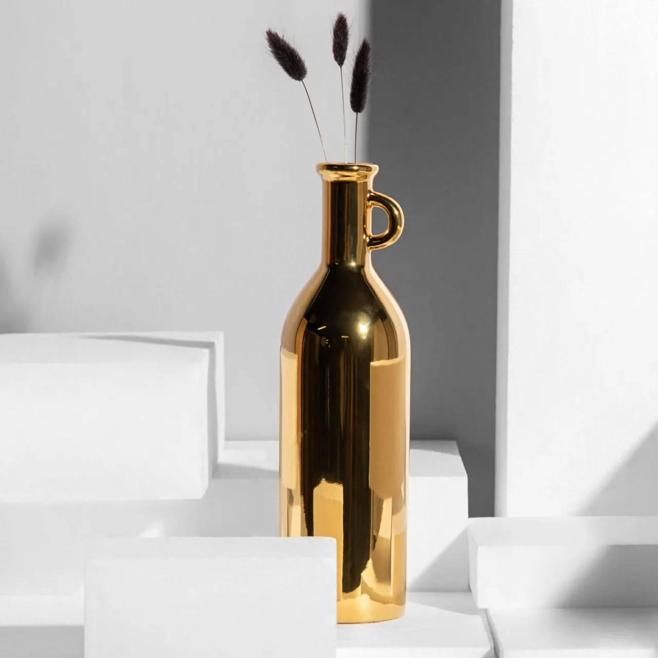 Lubisz dekoracje w stylu glamour? Wazon w złotym kolorze o błyszczącym wykończeniu stanie się centralnym punktem Twojego wnętrza. Wzbogacony o kwiat lub suche trawy będzie stanowił doskonałą dekorację na stołu, lub komodzie w pokoju dziennym.