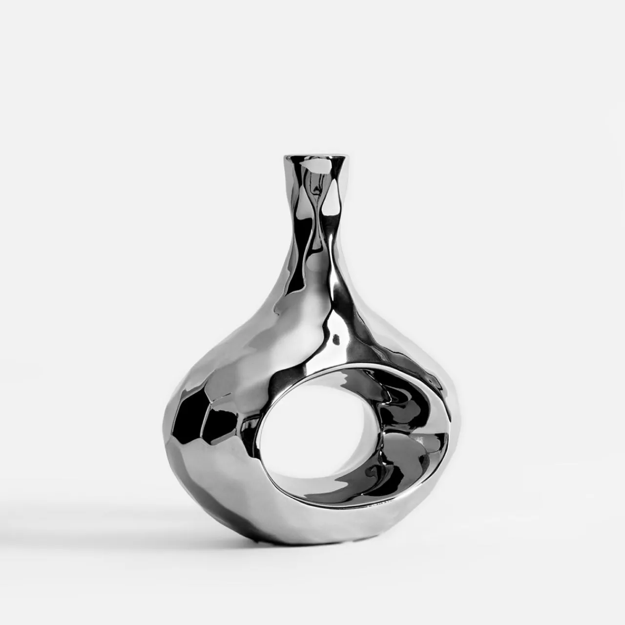 Wazon z dziurą pokochają wszyscy miłośnicy nowoczesnego designu. Wysoki na 20 cm o srebrnym wykończeniu odnajdzie się w aranżacjach typu glamour i nowoczesnych. Ustawiony na stole w jadalni lub komodzie w salonie stanie się centralnym punktem aranżacji.