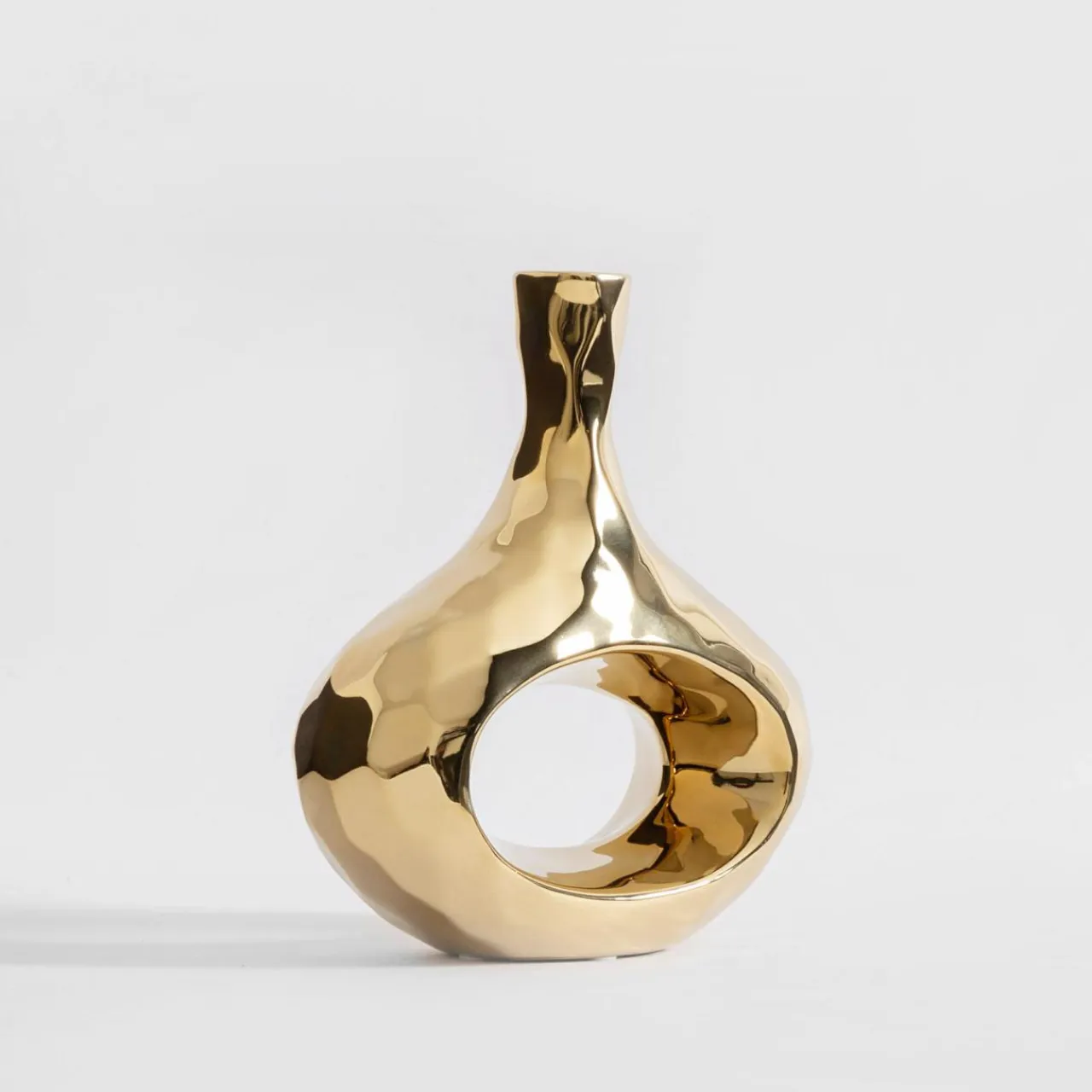 Wazon z dziurą pokochają wszyscy miłośnicy nowoczesnego designu. Wysoki na 20 cm o złotym wykończeniu odnajdzie się w aranżacjach typu glamour i nowoczesnych. Ustawiony na stole w jadalni lub komodzie w salonie stanie się centralnym punktem aranżacji.