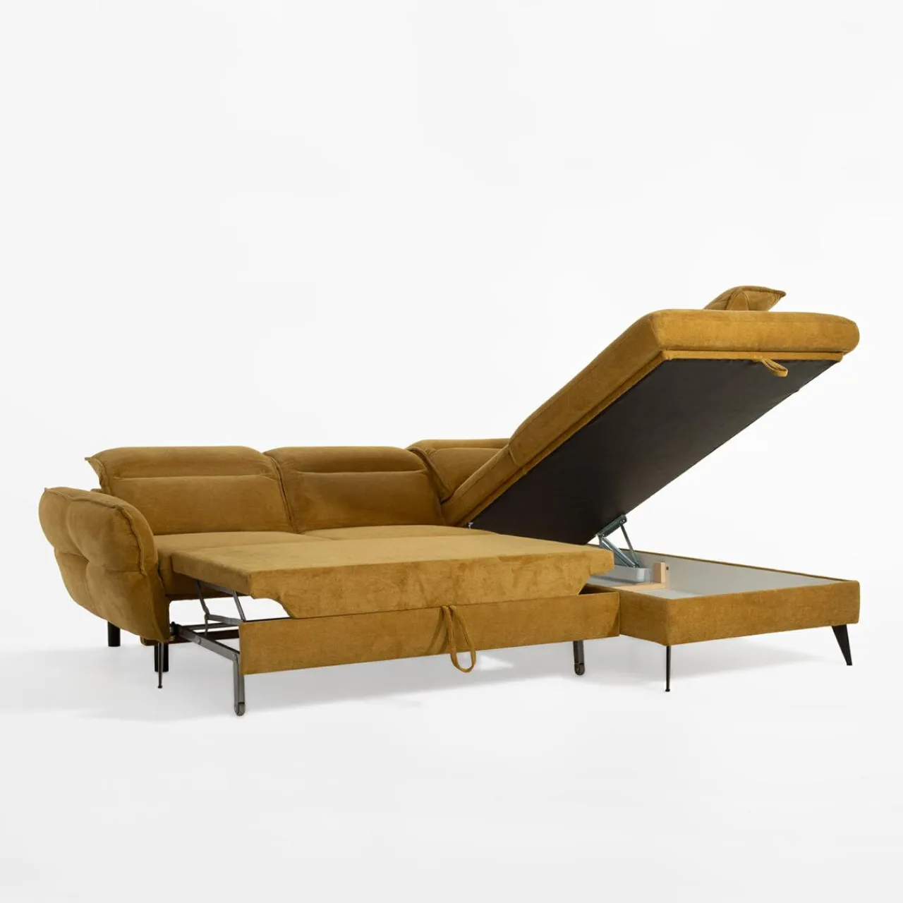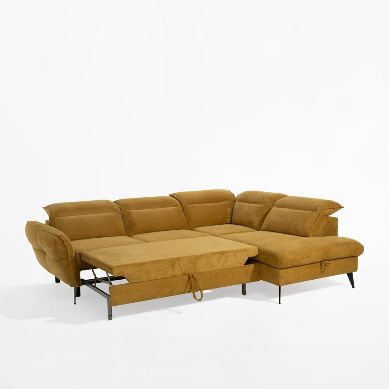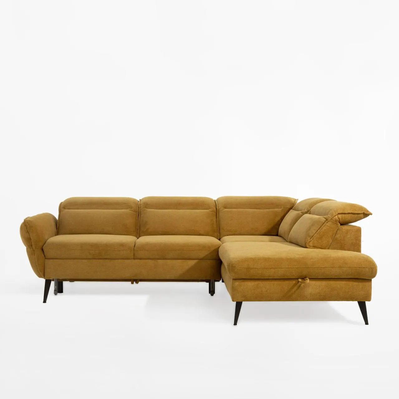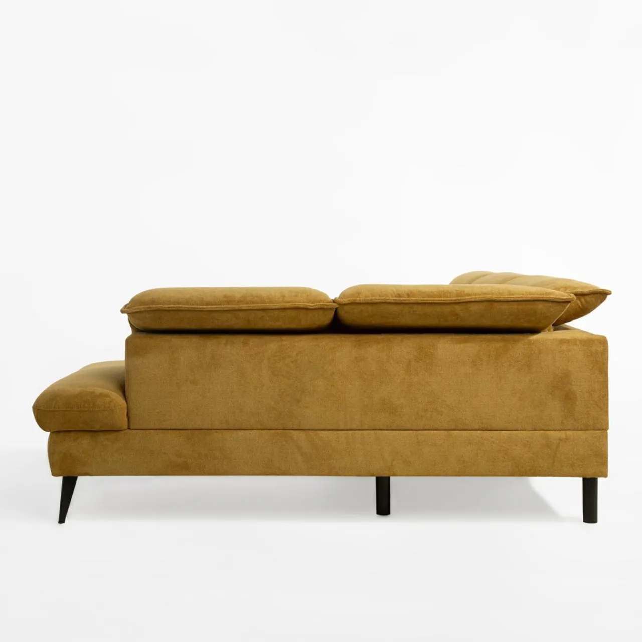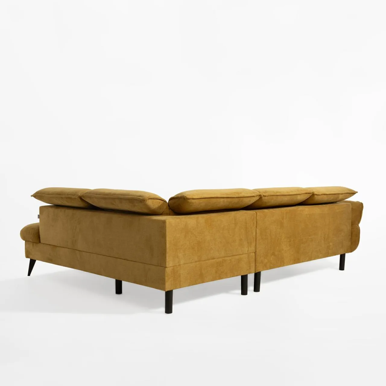 Miękka linia mebla kojarzy się z wygodą podczas wypoczynku, a musztardowy kolor tkaniny wprowadzi nieco ciepła do wnętrza domu. Całości obrazu dopełniają ukośne nóżki w czarnym kolorze.