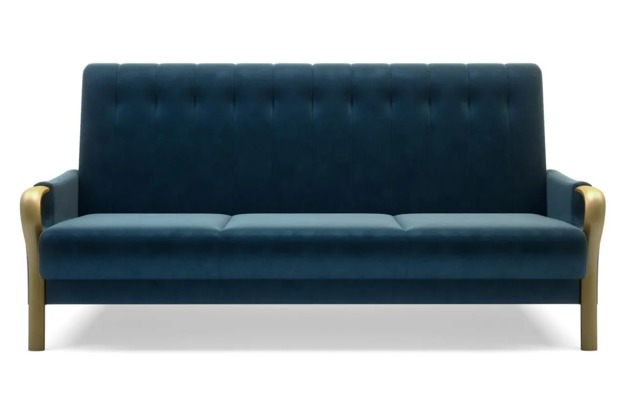 Granatowa, miękka tapicerka i drewniane wykończenie idealnie wpasują się w estetykę retro.