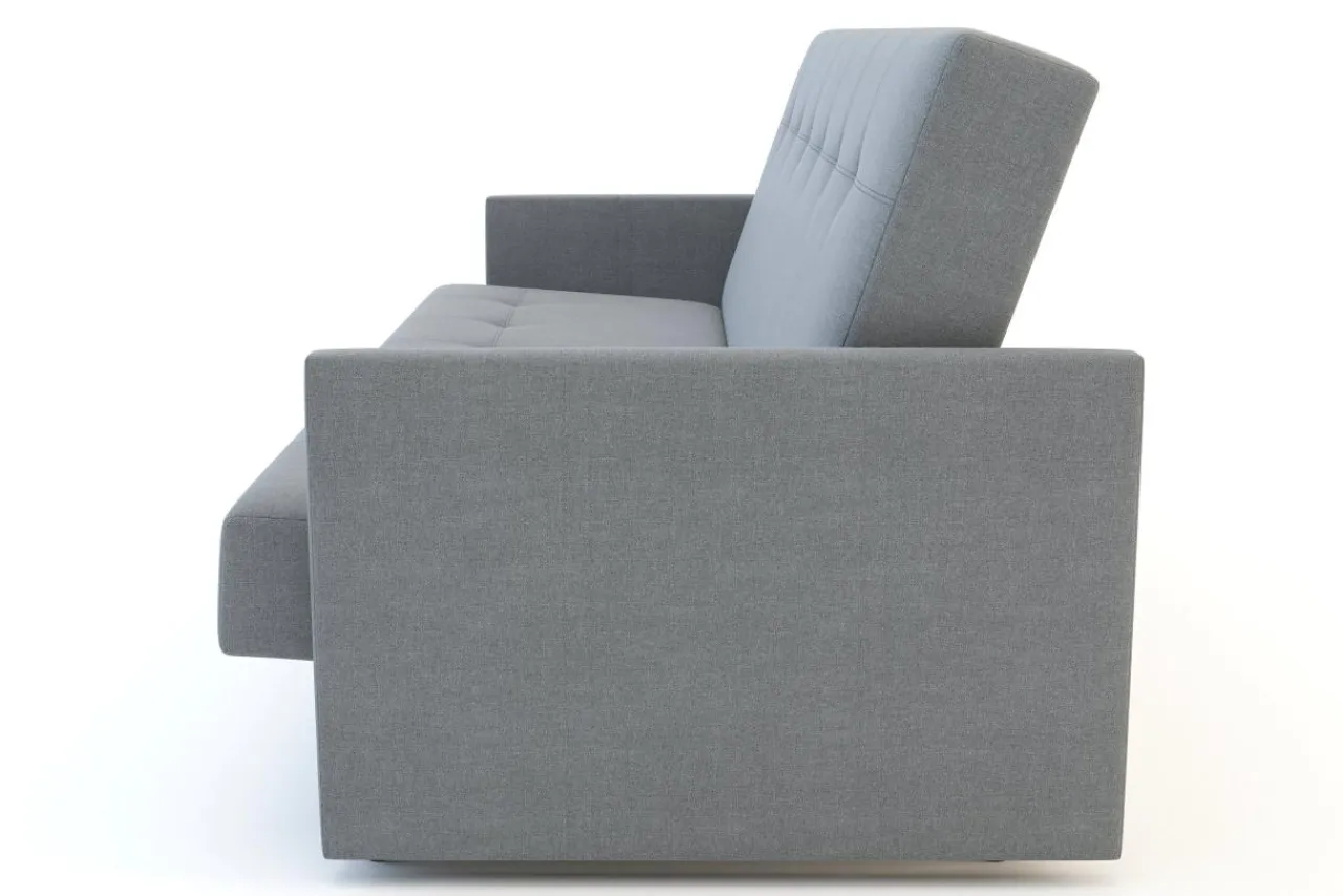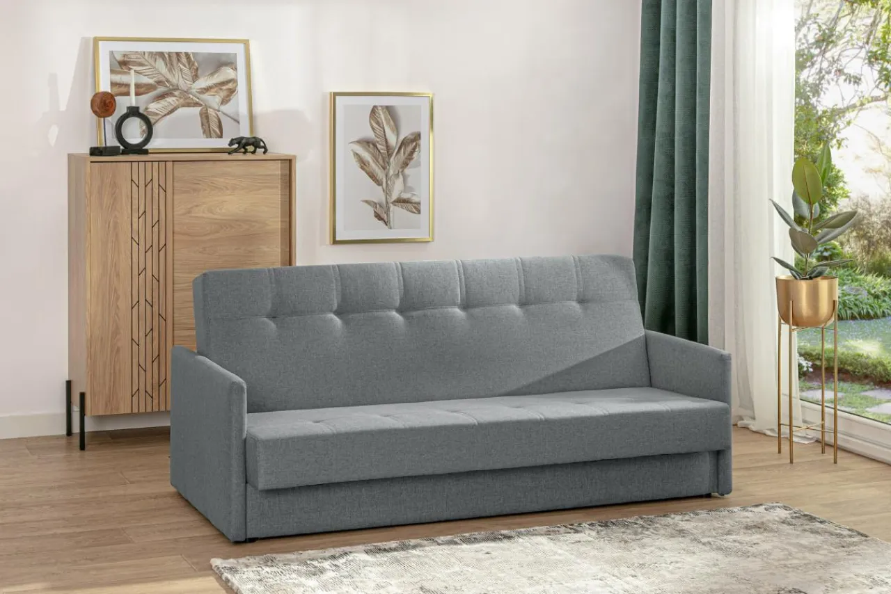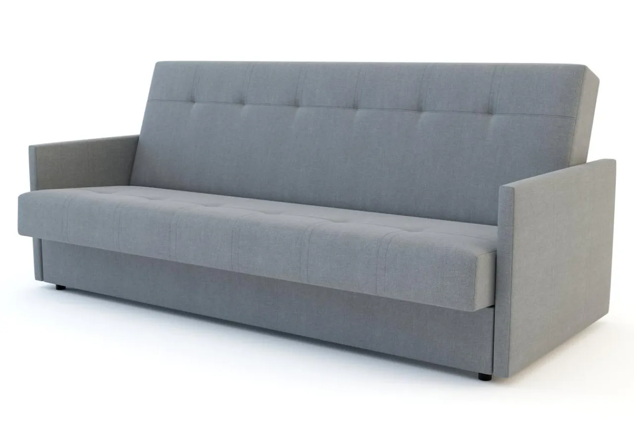 Ma wąskie podłokietniki i ozdobne wciągi na oparciu i siedzisku – dzięki temu wygląda jak tradycyjna sofa.