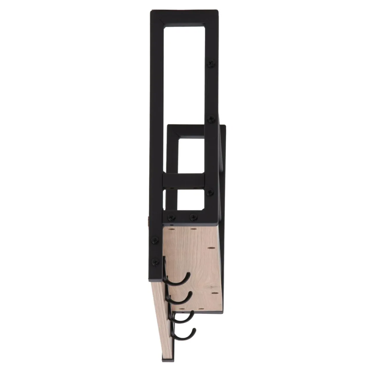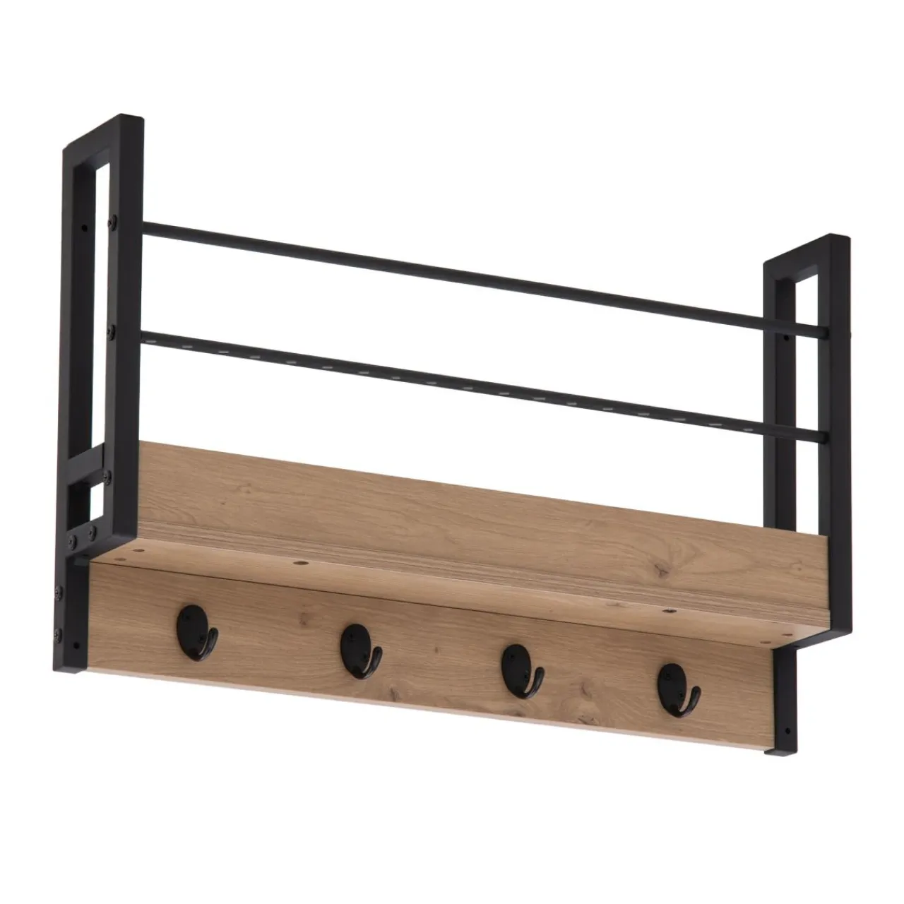 Korpus wieszaka wykończony jest okleiną drewnopodobną. Rysunek słojów i sęków przypomina naturalne drewno dębowe.