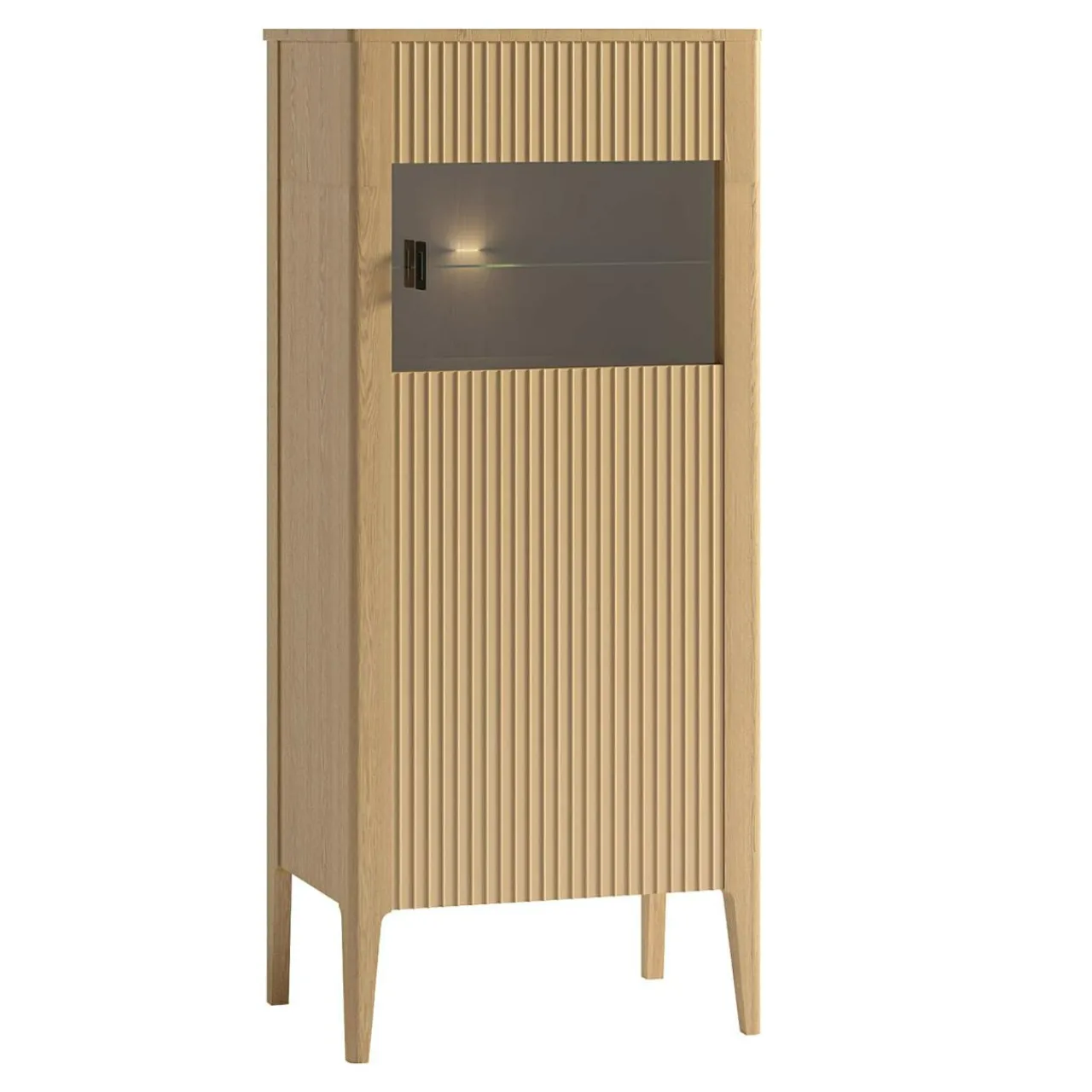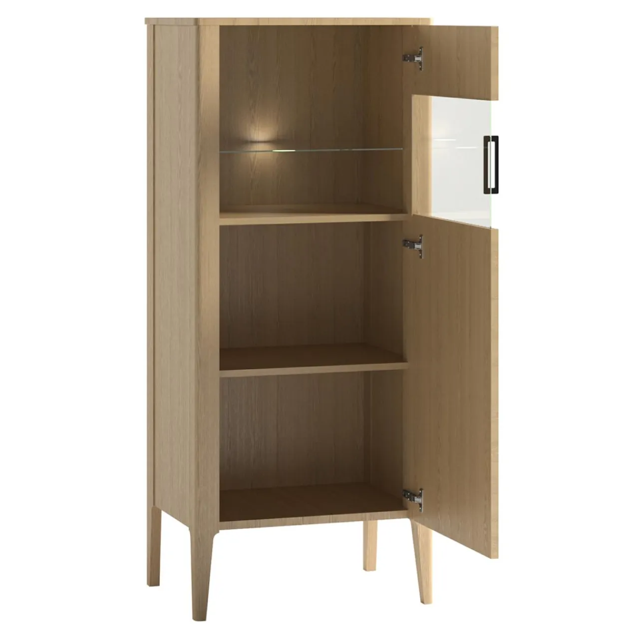 Nowoczesna drewniana witryna NAVARRA stanowi praktyczne uzupełnienie aranżacji salonu lub jadalni.