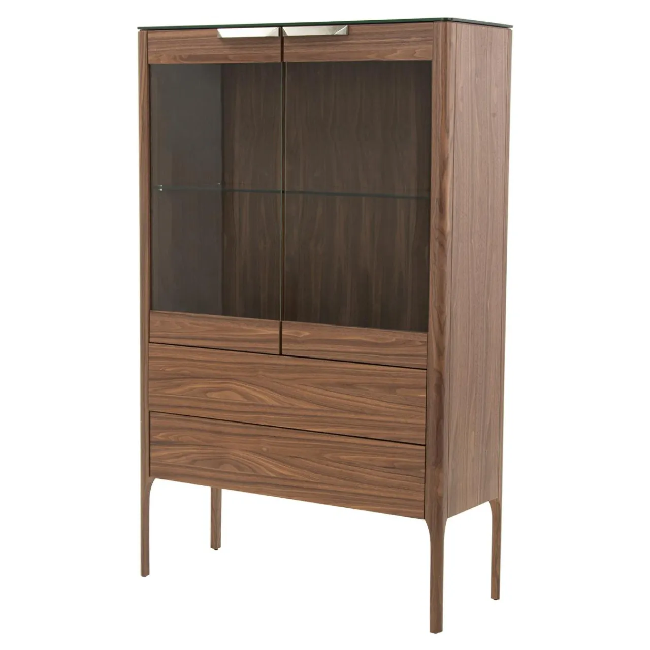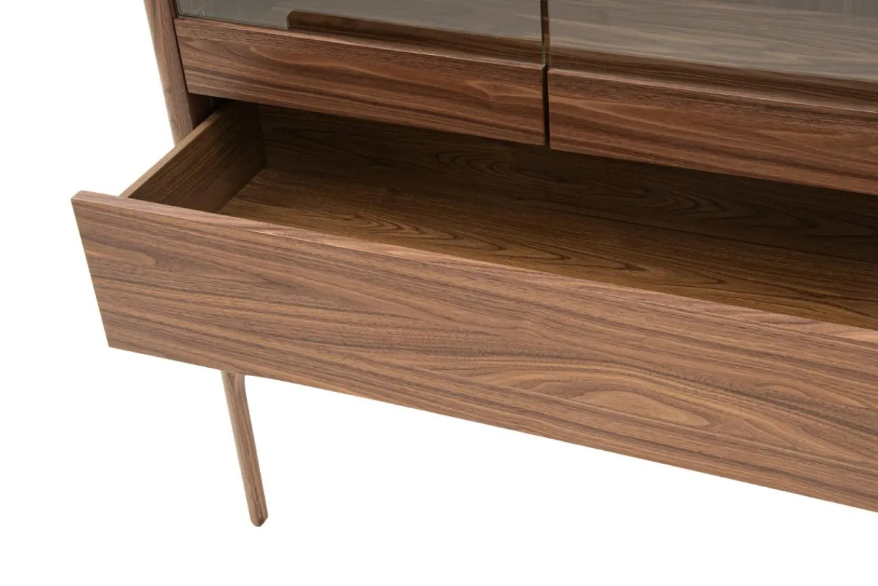 Witryna CHARTUM została pokryta fornirem orzechowym i zabezpieczona lakierem. Jego ciemna barwa sprawia, że mebel pasuje do nowoczesnych i eleganckich przestrzeni.