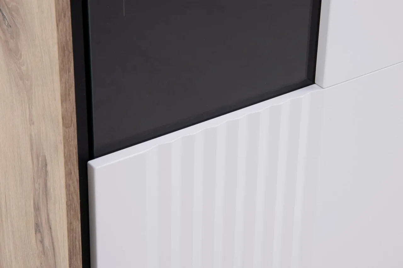 Klasyka zaprezentowana w modernistycznym wydaniu. Bryły skonstruowane są w przemyślany sposób: korpusy w jasnym kolorze dębu postawione są na czarnych podstawach, a całość zamykają białe fronty.