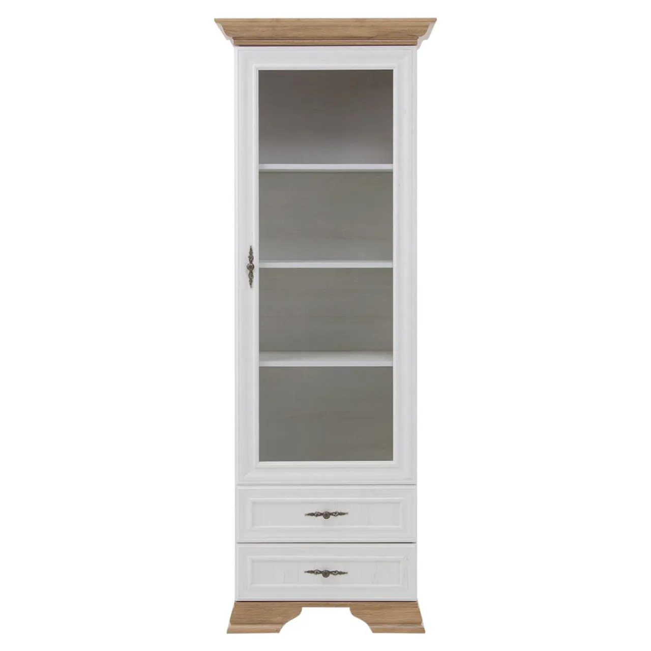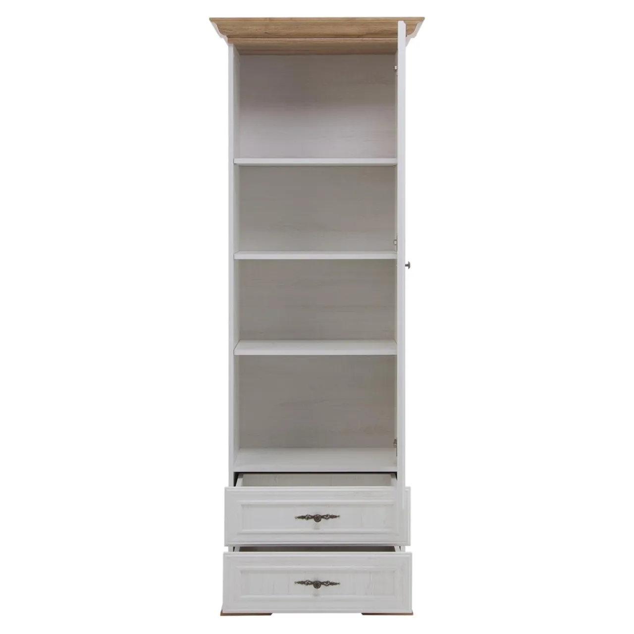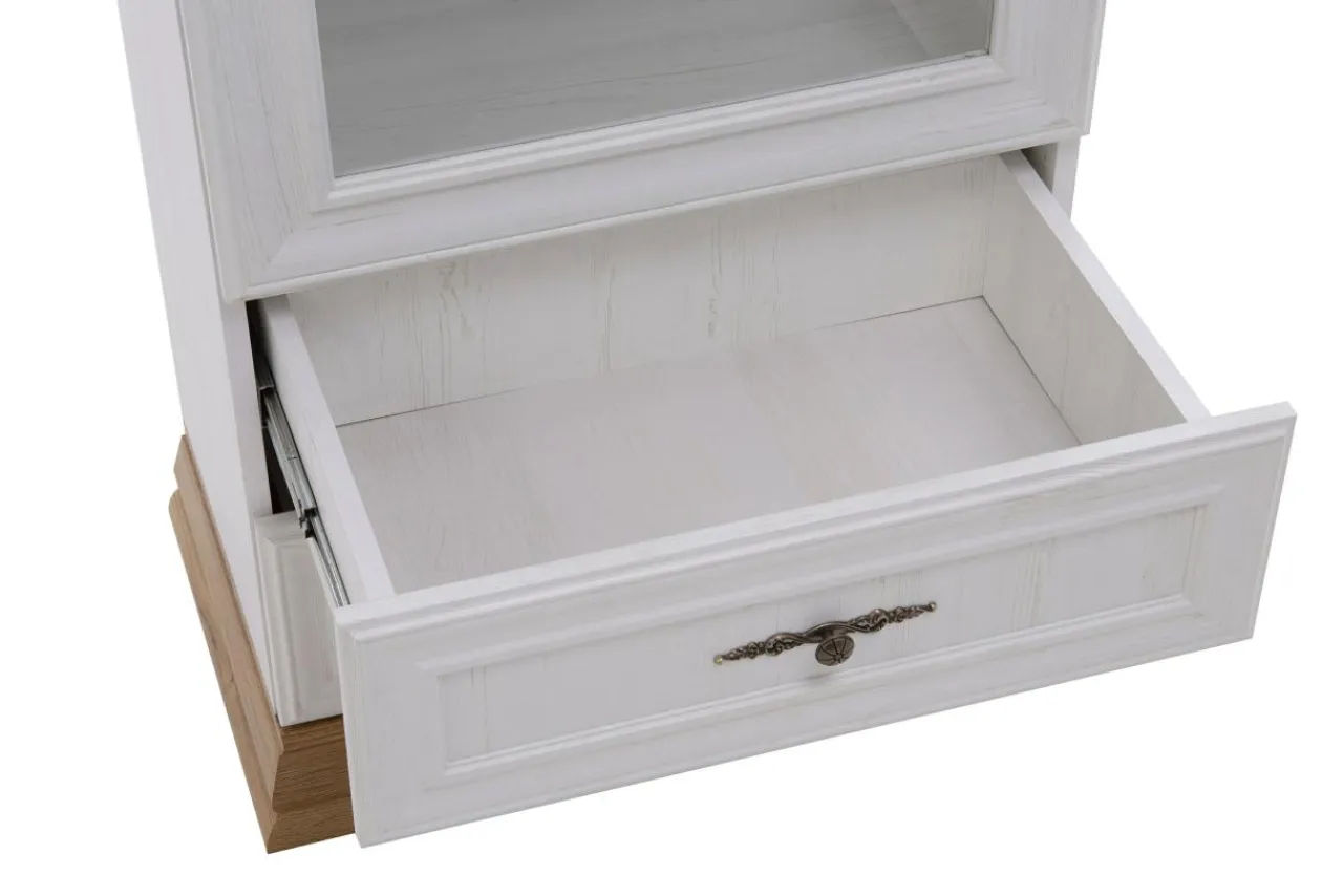 - Witrynę wykonano z płyty wiórowej w kolorze bielonej sosny andersen. Widoczny rysunek imitujący naturalne usłojenie drewna i przetarcia sprawiają, że komoda przypomina postarzany mebel.