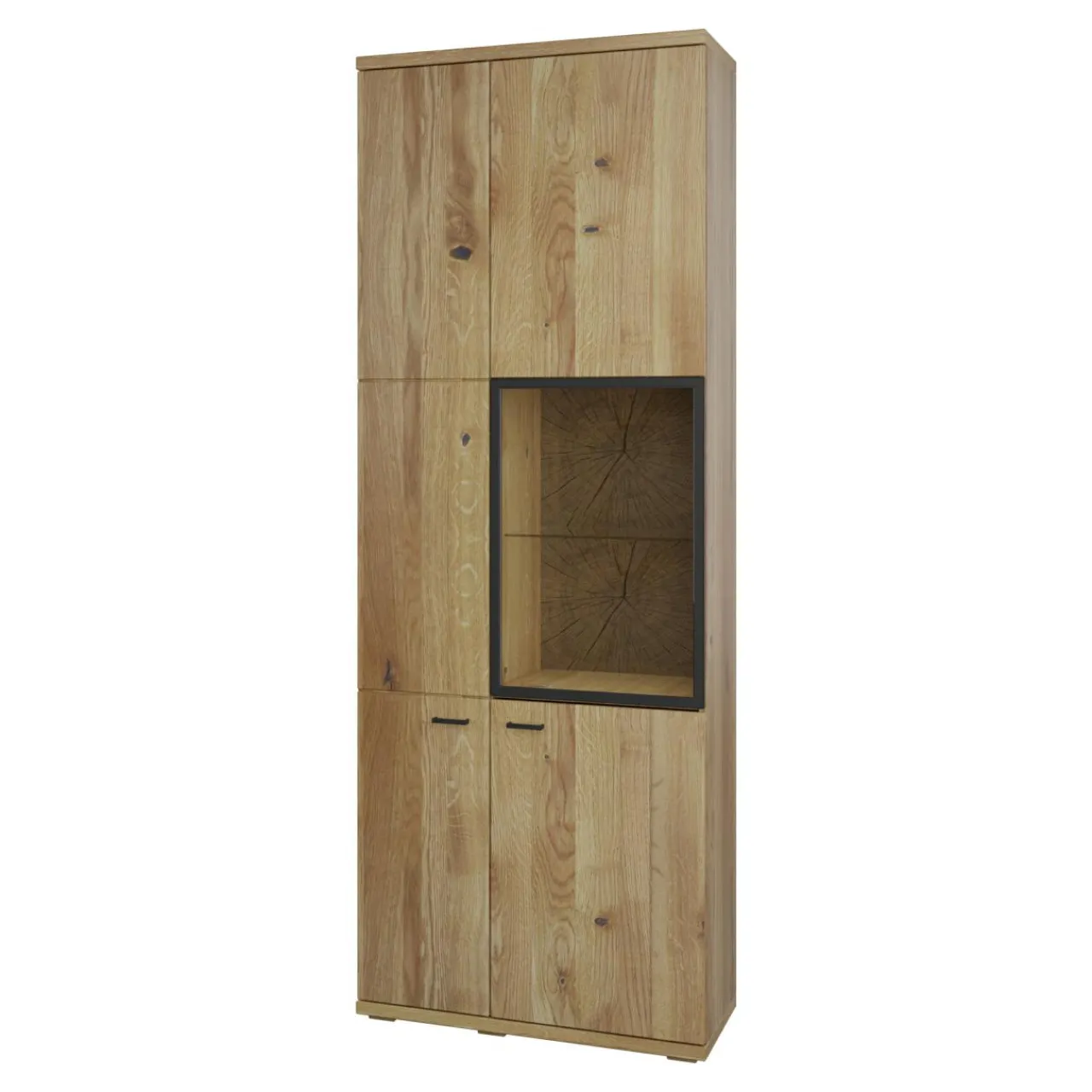 Witrynę FLORA docenisz za naturalny design – fronty z litego drewna oraz pień na tylnej ściance podkreślają unikatowy wygląd mebla.
