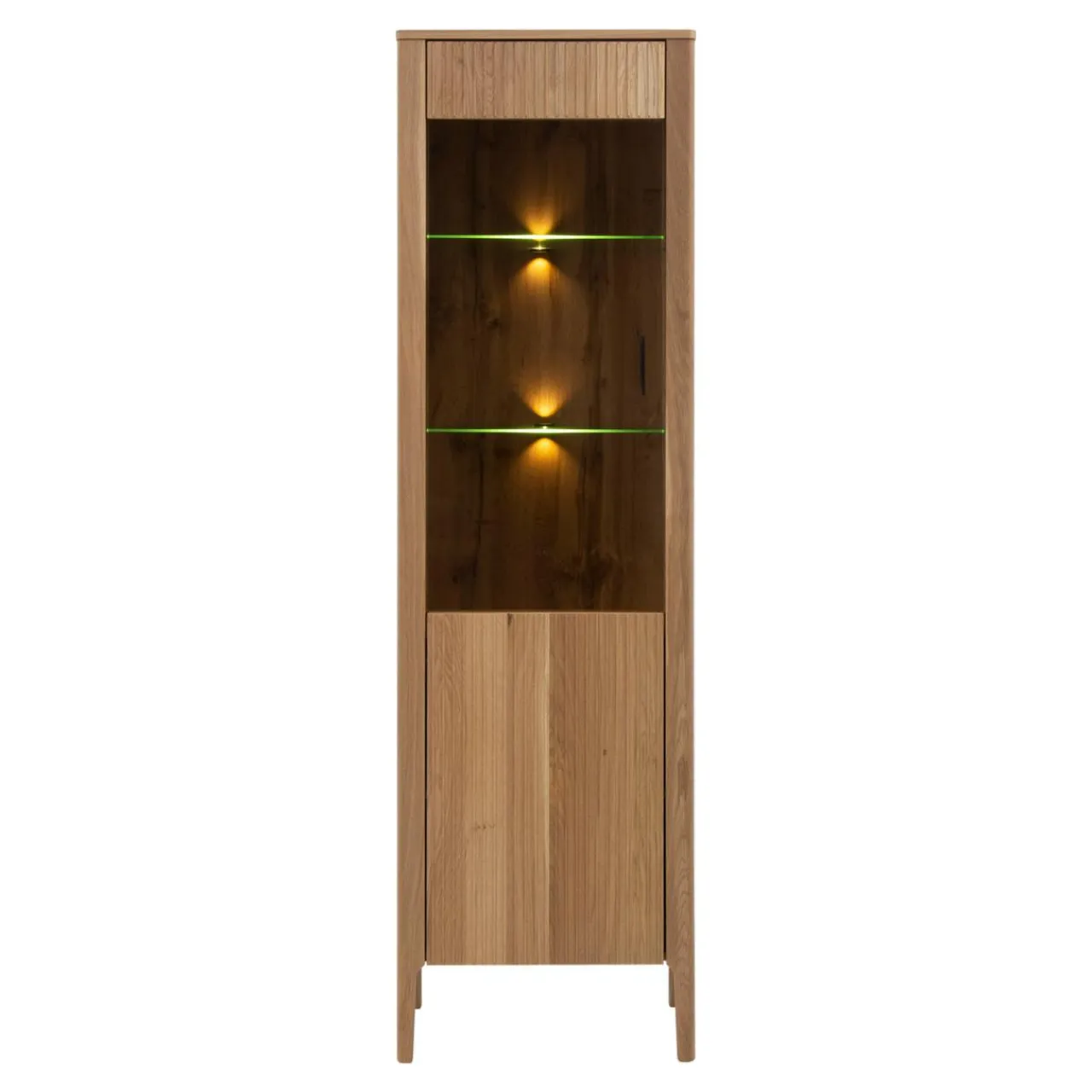 - Witryna posiada wbudowane oświetlenie typu led. Które podkreśli piękno prezentowanych przedmiotów, a także nada pomieszczeniu klimatu.