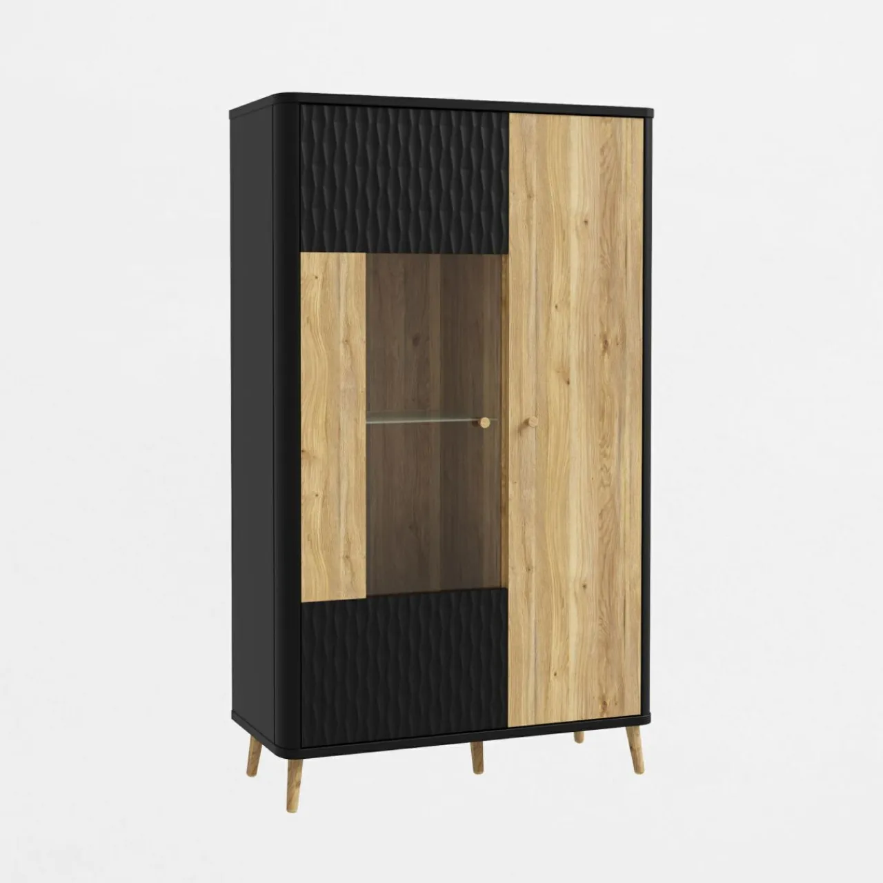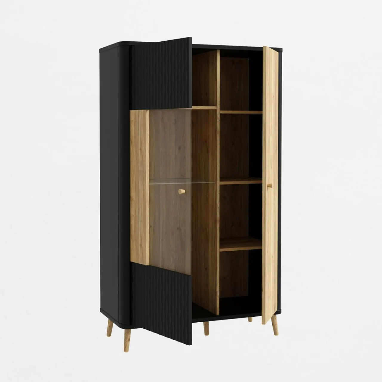 - Nietuzinkowe wzornictwo czarnych frontów tworzy kontrast dla rysunku drewna w odcieniu mauvella oak.