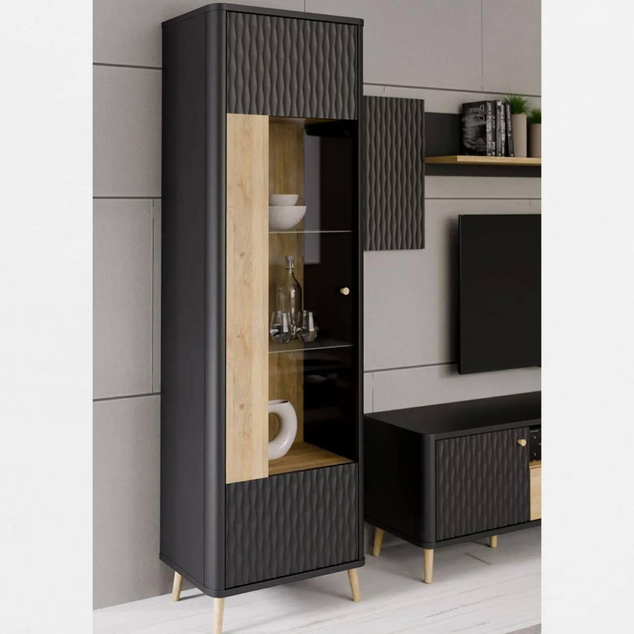 - Nietuzinkowe wzornictwo czarnych frontów tworzy kontrast dla rysunku drewna w odcieniu mauvella oak.