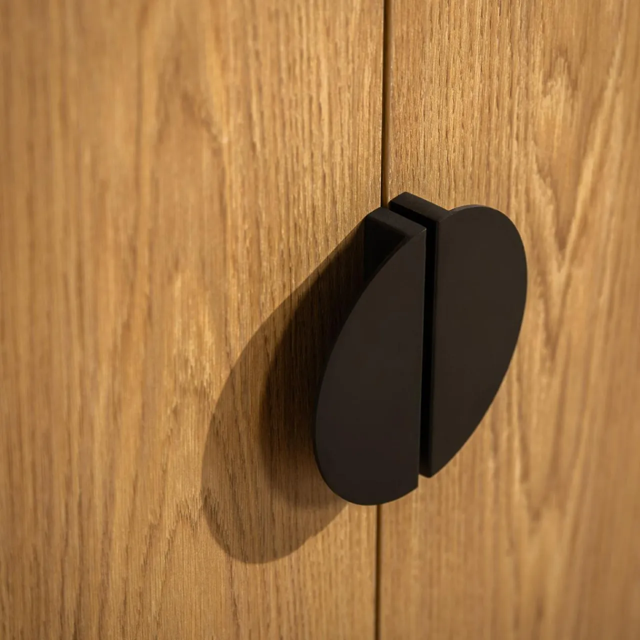 - Półokrągłe metalowe uchwyty wyraźnie odznaczają się na frontach, tworząc kontrast dla ciemnych mebli.