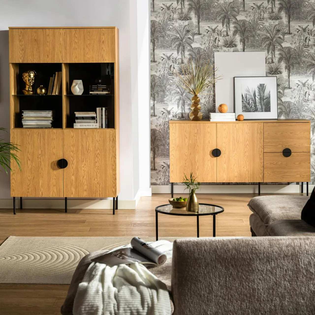 - Meble charakteryzuje wykończenie w odcieniu dębu baltic. Rysunek drewna tworzy przytulny klimat w pomieszczeniu