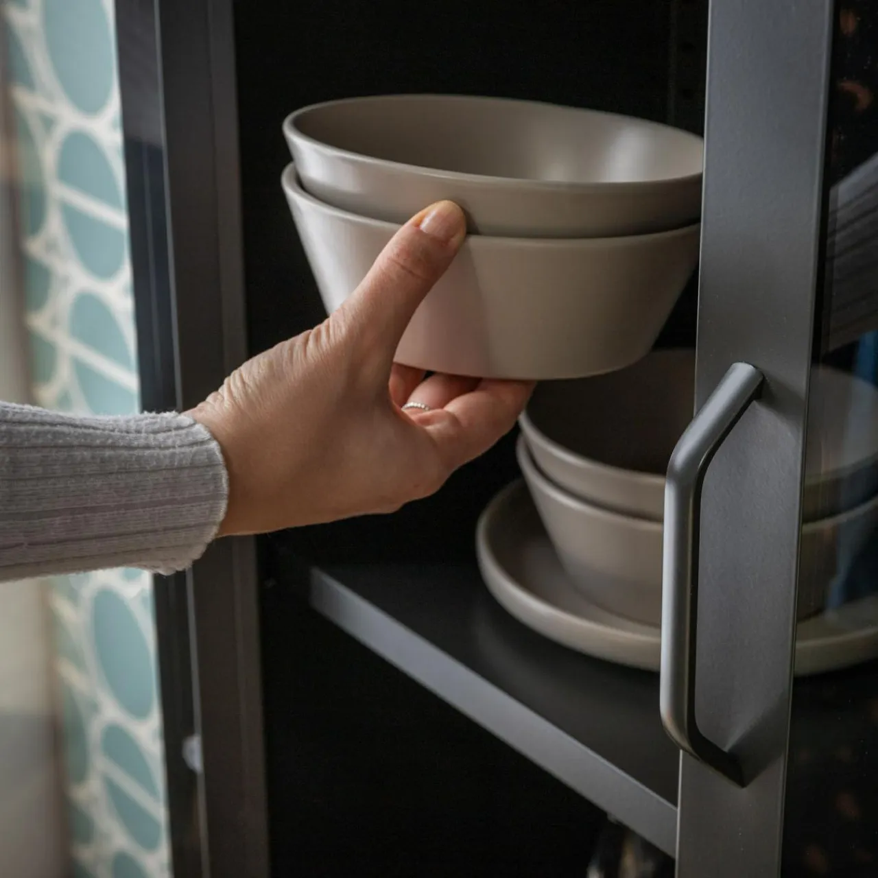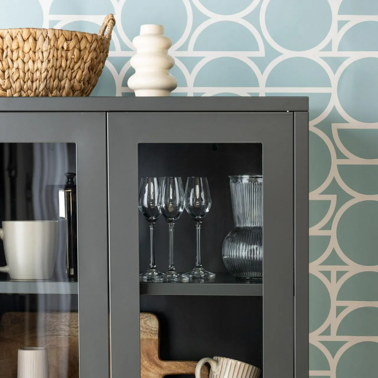 W witrynie BOUIAN wyeksponujesz zastawę obiadową, dekoracje czy książki. Będą bezpieczne przed kurzem za szklaną zabudową.