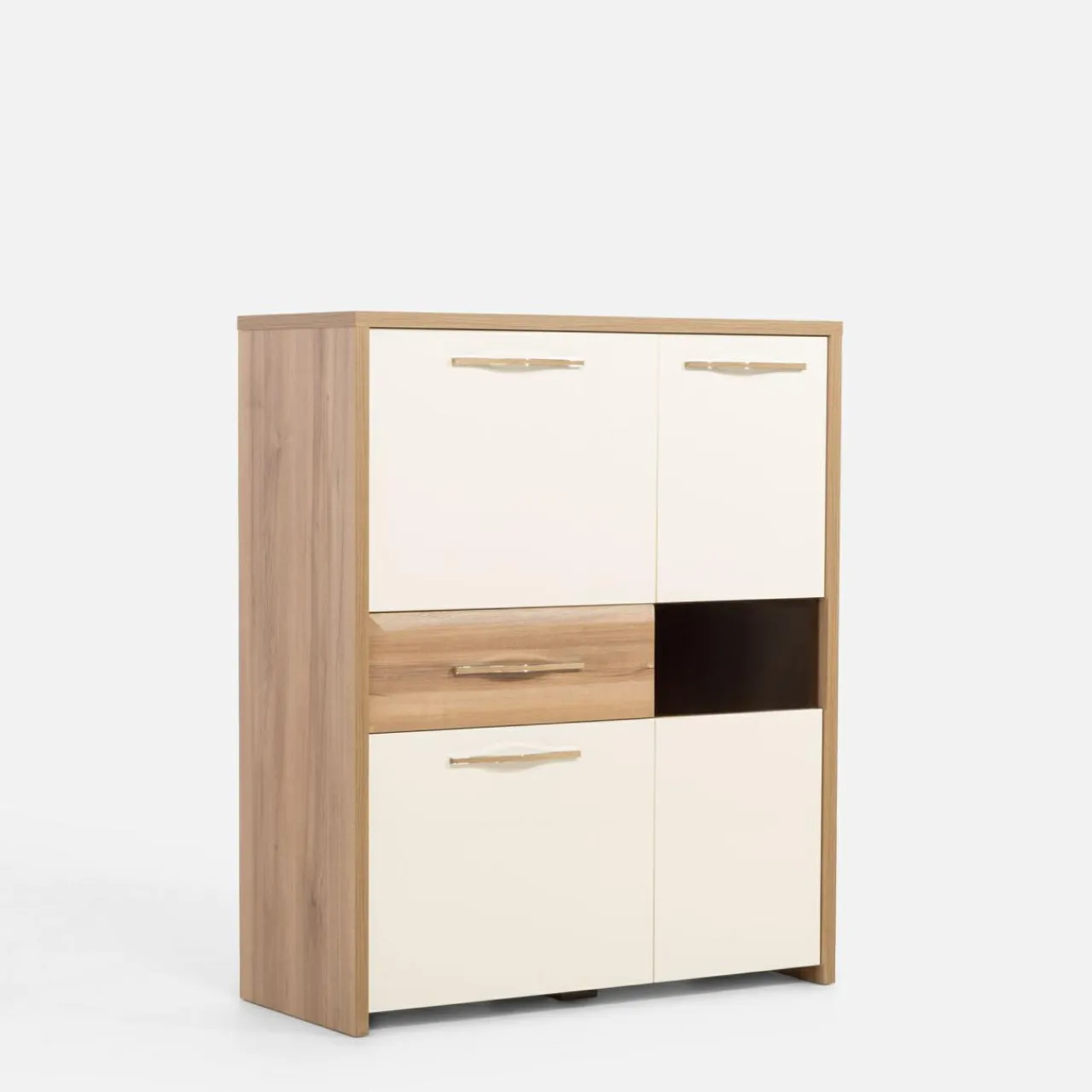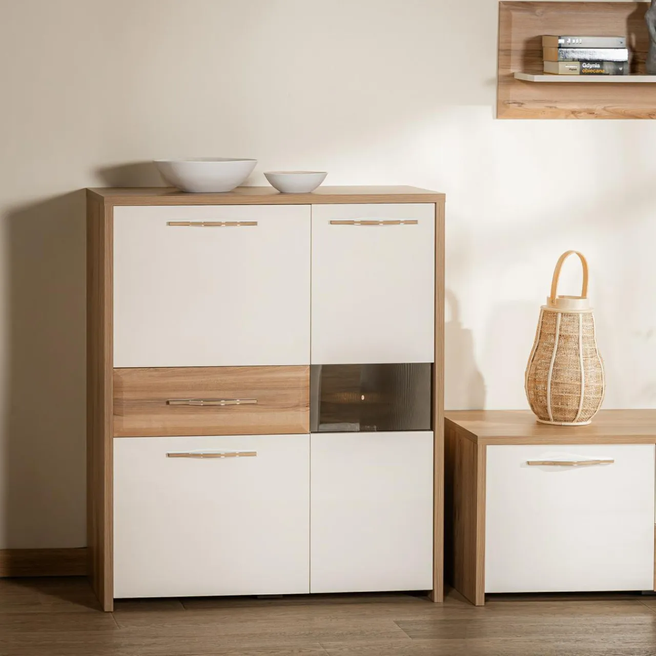 Witryna GALA niska to kompaktowy, a jednocześnie elegancki mebel o nowoczesnym wyglądzie. Wykończenie w kolorze drewna i beżowym wysokim połysku tworzy stylowy kontrast, idealny do współczesnych wnętrz.