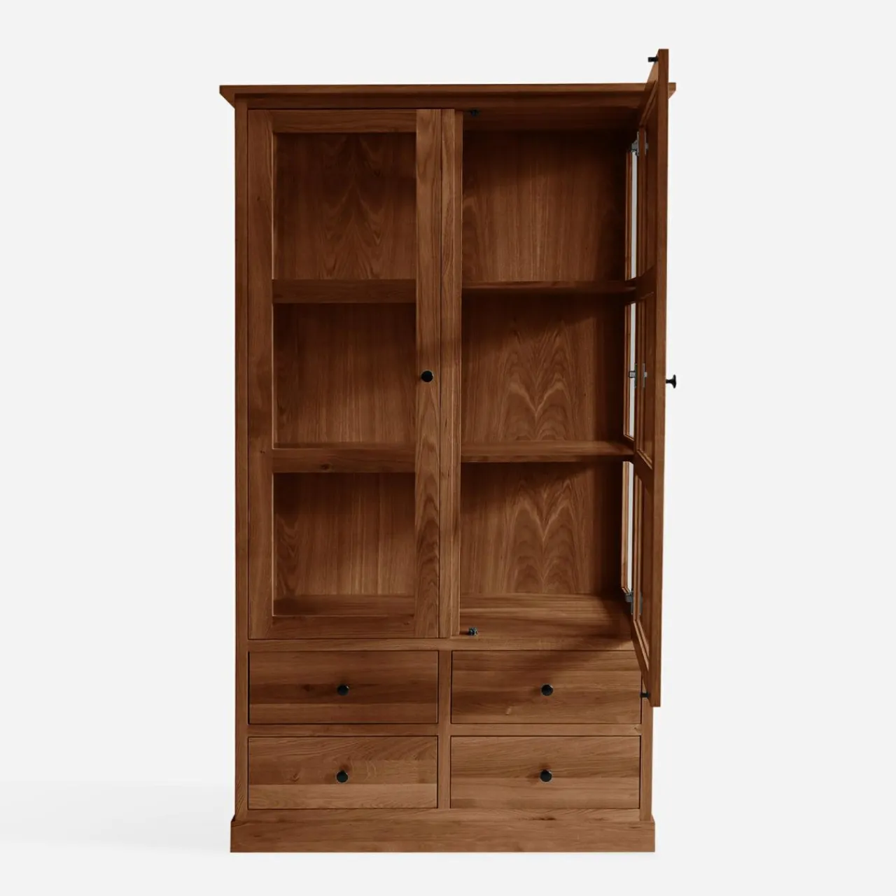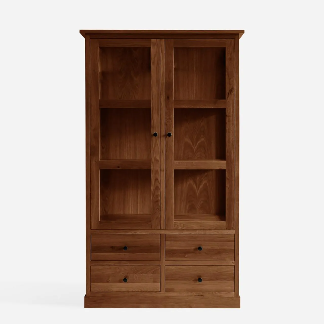 Witryna STELLA to praktyczny mebel, wykonany z litego drewna w odcieniu dąb koniakowy. Dzięki 4 szufladom oraz przeszklonym półkom, łączy wygodę przechowywania z estetyką ekspozycji. Jest idealnym wyborem do salonu, jadalni lub gabinetu.