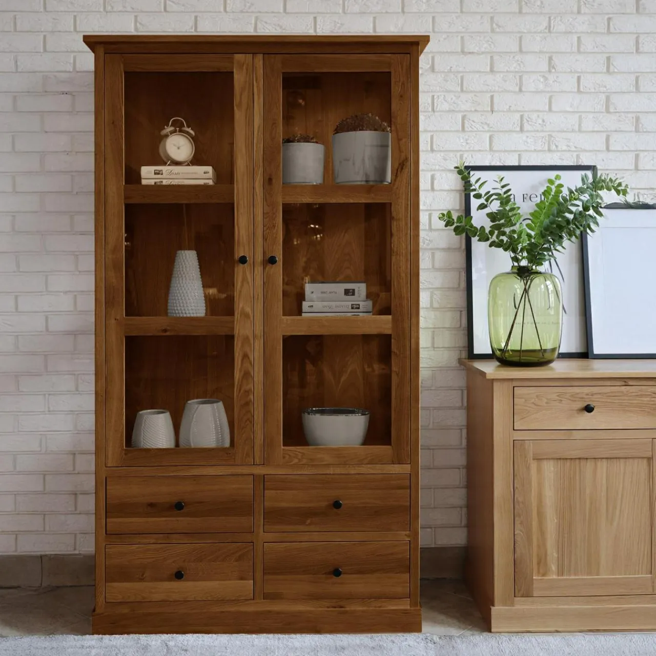 Witryna STELLA to praktyczny mebel, wykonany z litego drewna w odcieniu dąb rustykalny. Dzięki 4 szufladom oraz przeszklonym półkom, łączy wygodę przechowywania z estetyką ekspozycji. Jest idealnym wyborem do salonu, jadalni lub gabinetu.