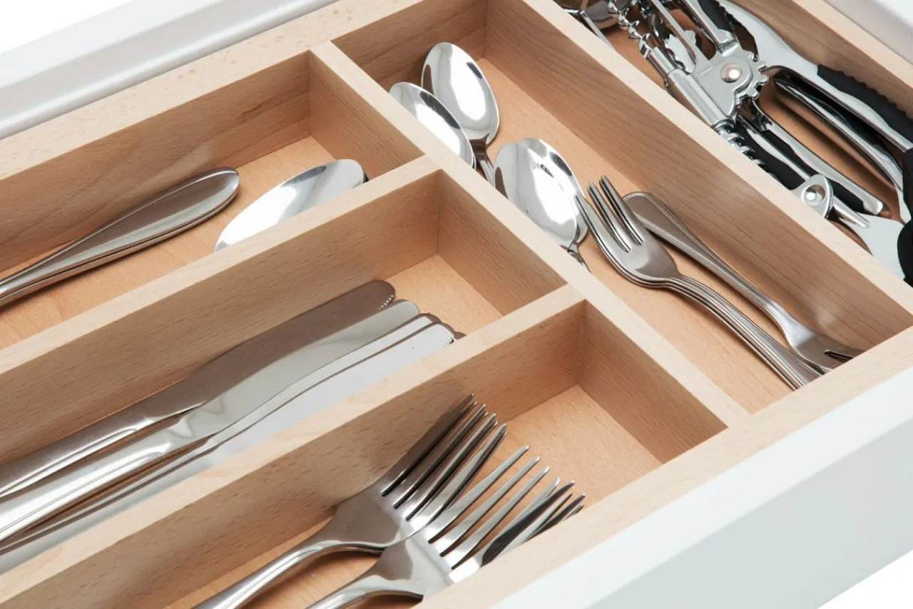 Wkład na sztućce Q-WOOD z drewna bukowego to funkcjonalny dodatek do szuflad Hettich Innotech Atira.