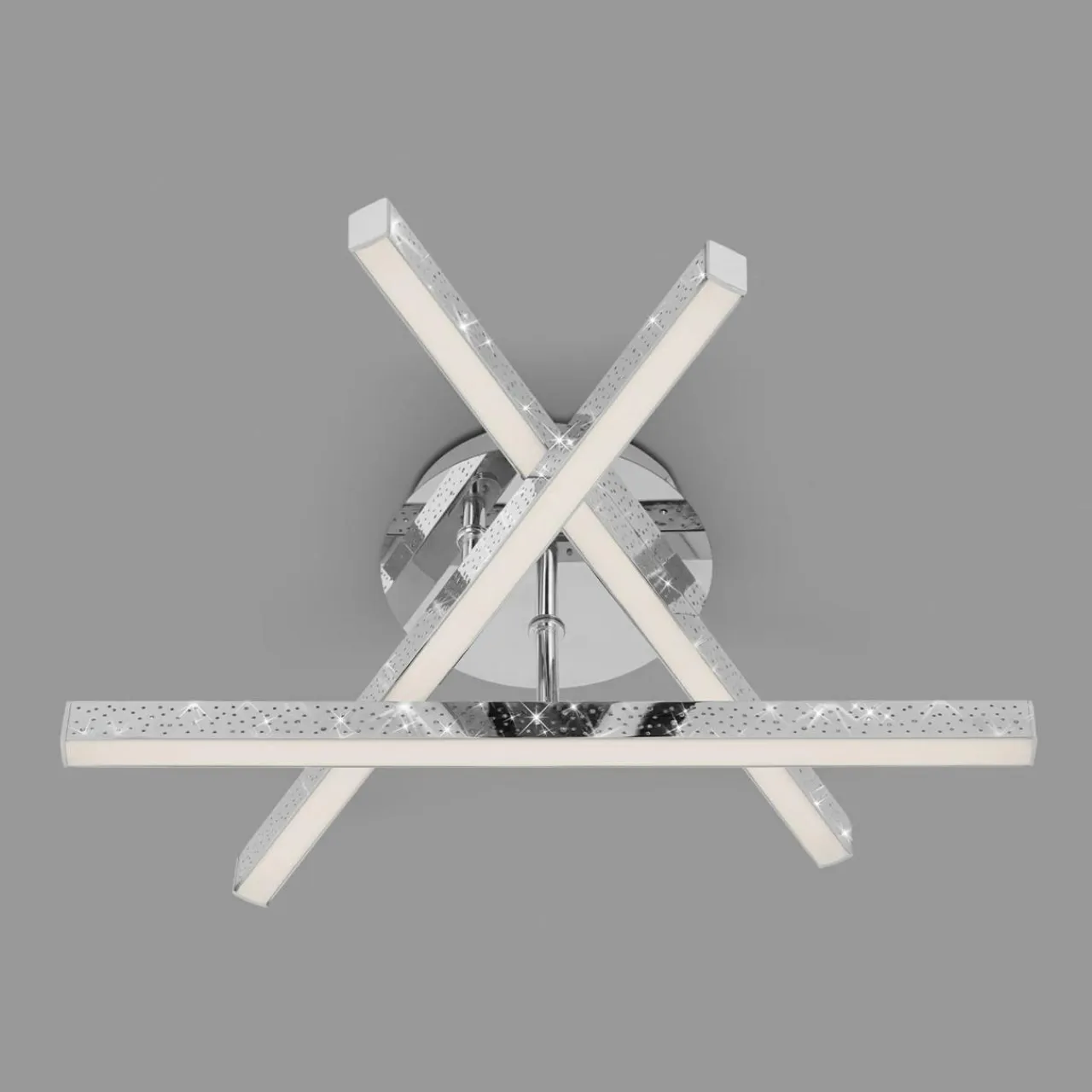 Okrągłą podstawę lampy ozdobiono 3 listwami, których krzyżujące się ramiona tworzą wzór trójkąta. Dodatkowo chromowany kolor wykończenia pasuje do nowoczesnych, minimalistycznych wnętrz i podkreśla efekt, jak dają brokatowe punkciki rozsiane po całej oprawie.