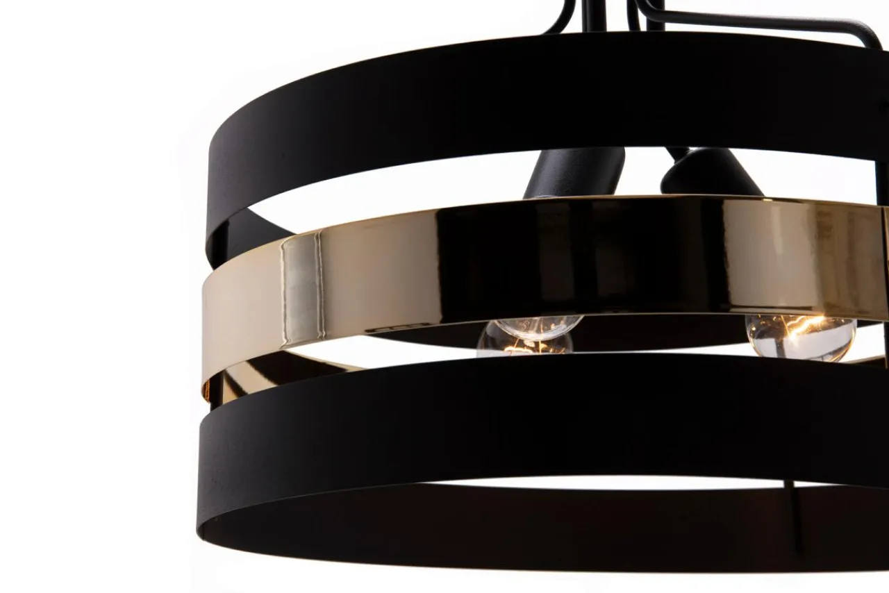 - Trzy źródła światła zostały osłonięte metalowym kloszem w czarno-złotym kolorze