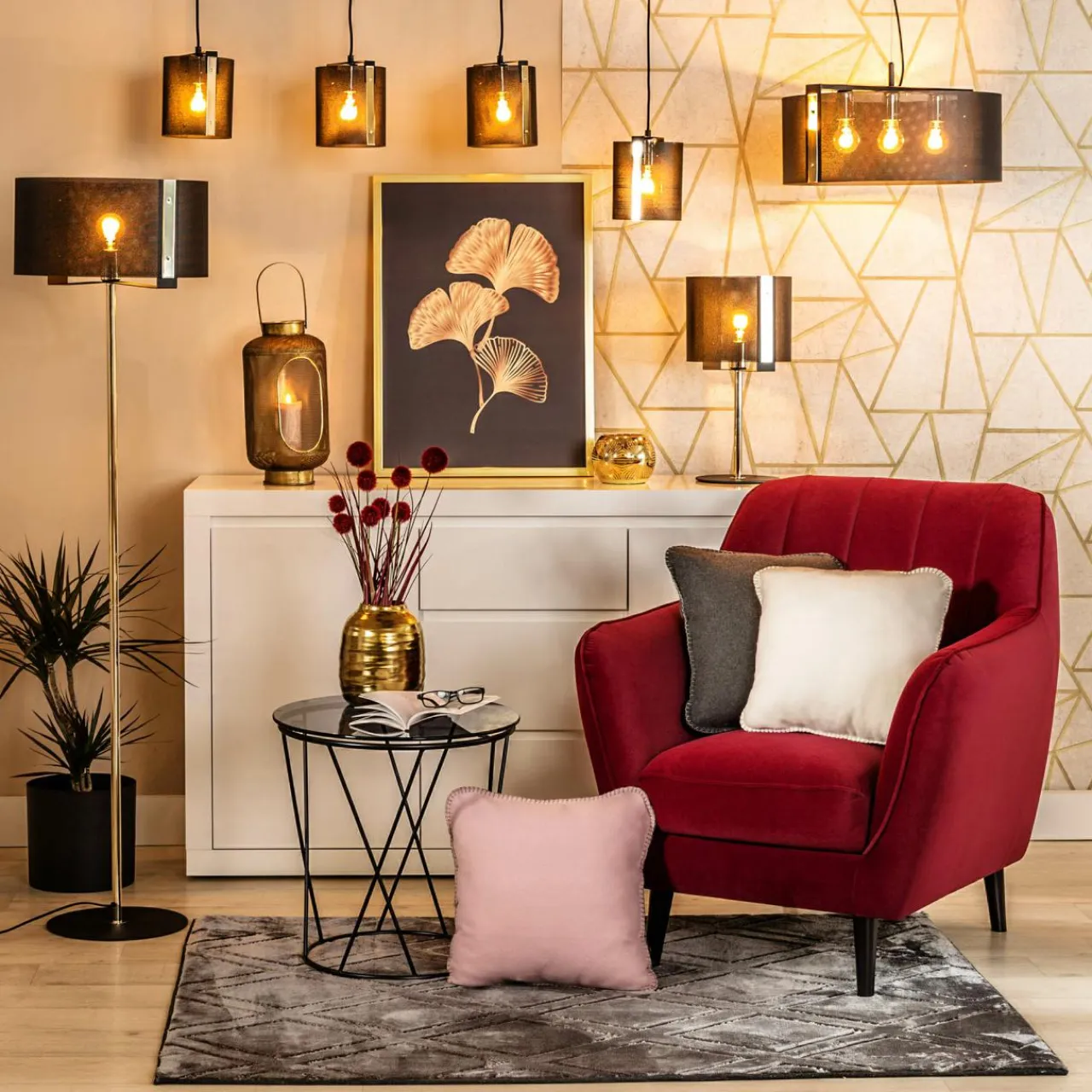 Uwagę zwracają wstawki w złotym kolorze (przy kloszu oraz podstawie). ETRO jako całość dodaje pomieszczeniu szyku i elegancji. Świetnie sprawdza się w połączeniu z ciemniejszymi aranżacjami, a do jasnego wnętrza wprowadza ciekawy element kontrastu.