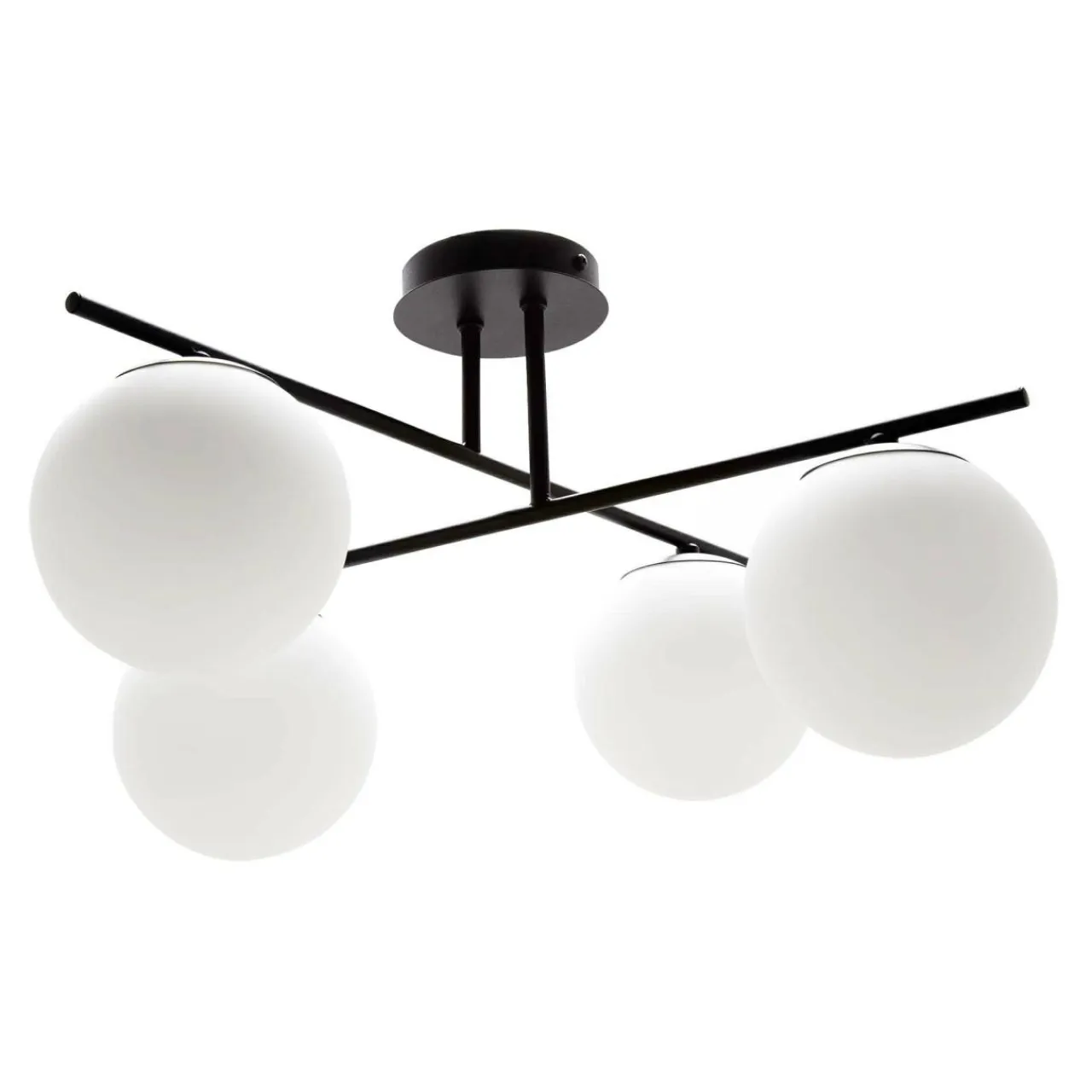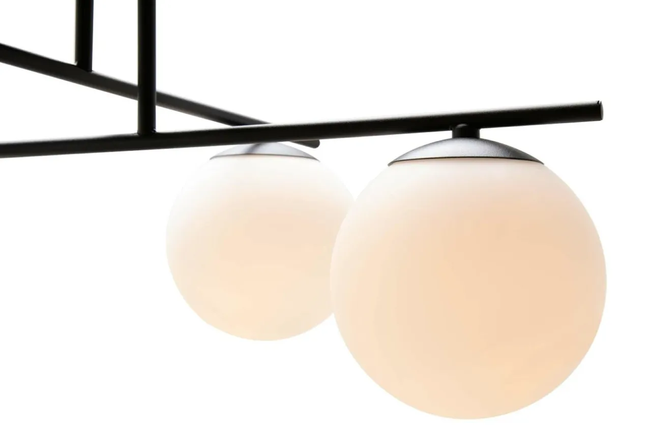 Klosze, które wieńczą lampę są połączone w przejrzysty sposób za pomocą prostopadle połączonych ramion. Mlecznobiałe kule całkowicie osłaniają żarówki, a wykończenie bazy w czarnym kolorze nadaje całości minimalistycznego posmaku i doskonale koresponduje z meblami w odcieniach szarości, czerni i bieli.