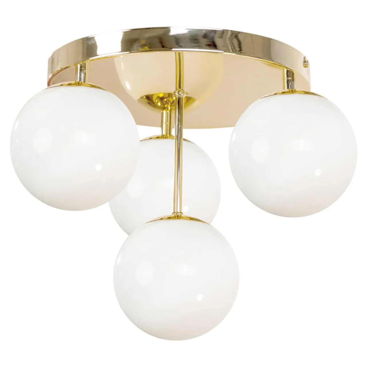 Złota kolorystyka okrągłej podstawy oraz ramion lampy, ich połysk oraz zwieńczenie w postaci okrągłych, mlecznobiałych kloszy w cudowny sposób lawiruje pomiędzy nowoczesnym designem, a zachowawczą formą.