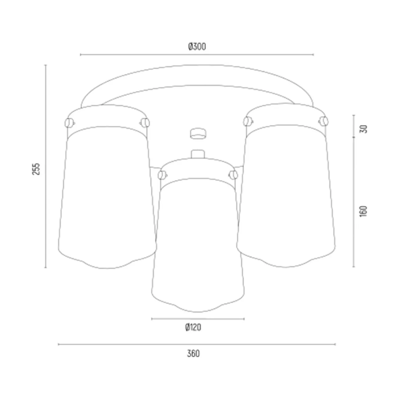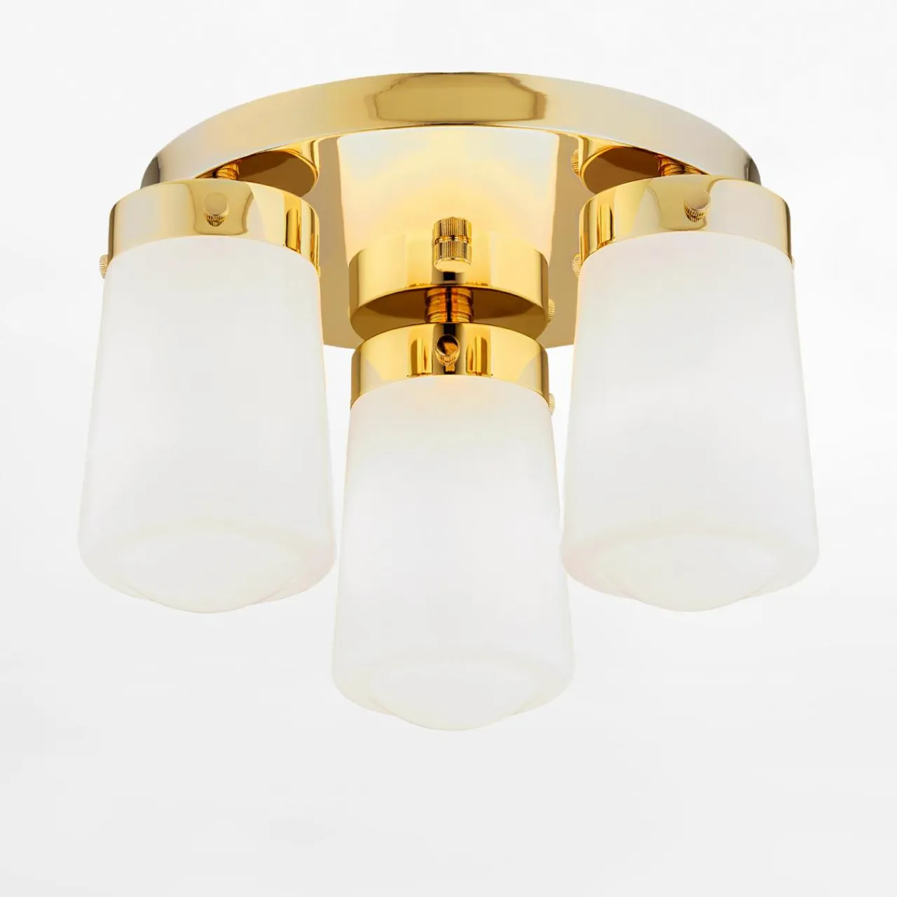 Posiada błyszczące wykończenie w kolorze mosiądzu oraz 3 białe klosze na okrągłej podstawie z miejscem na żarówki typu E27.