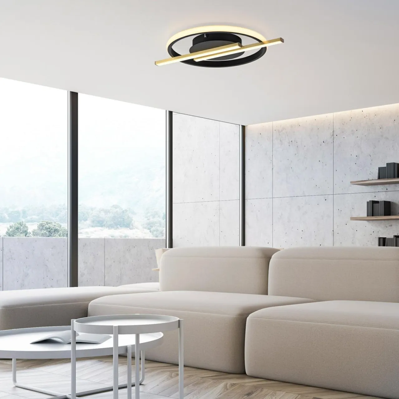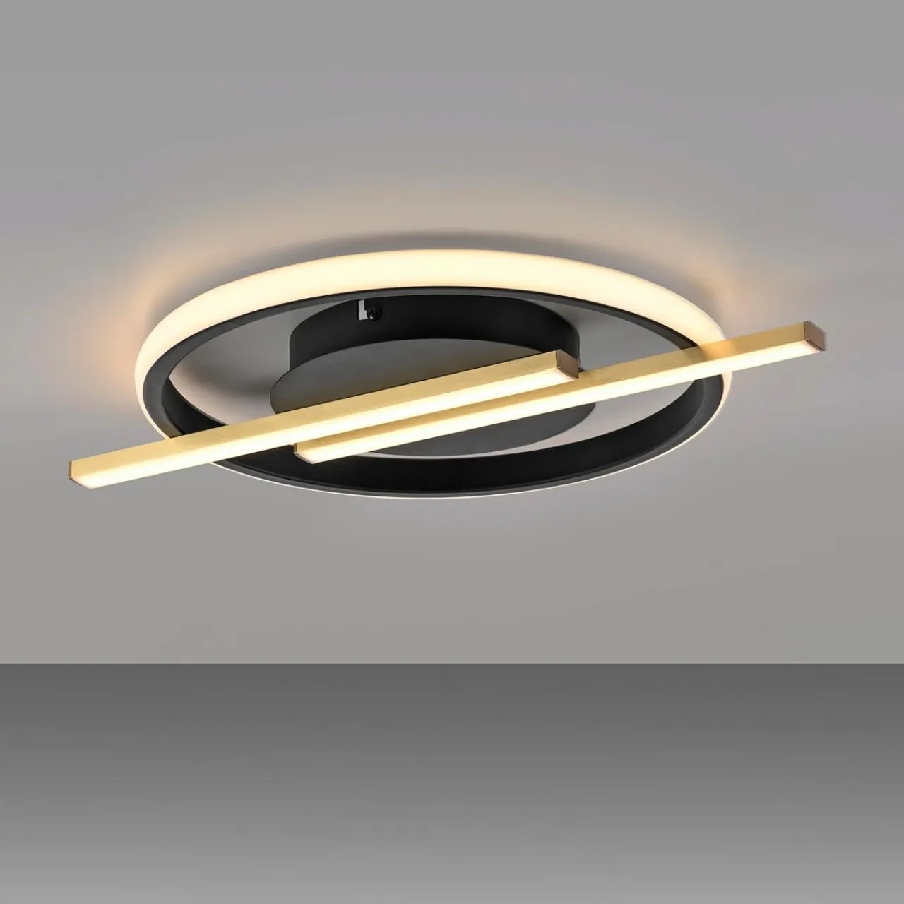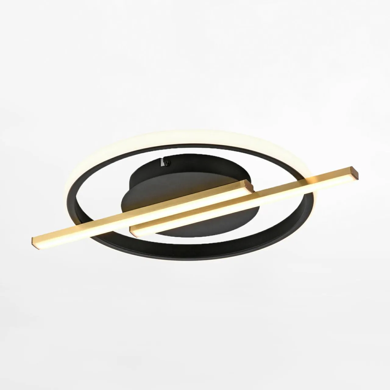 Pierścieniowa oprawa z panelem LED oraz prostym motywem ozdobnym w centrum przyciąga wzrok i dobrze komponuje się z nowoczesnymi aranżacjami.
