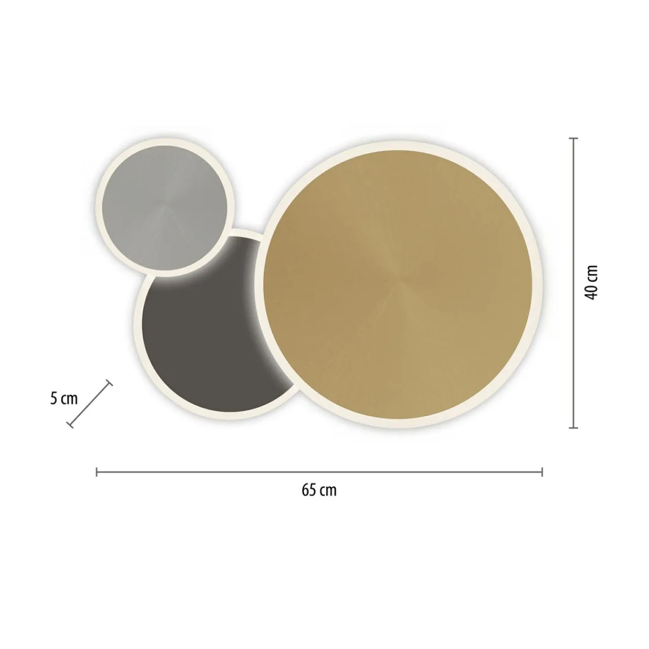 Oprawa ma kształt 3 podświetlonych okręgów z czarnym, szarym i złotym wypełnieniem.