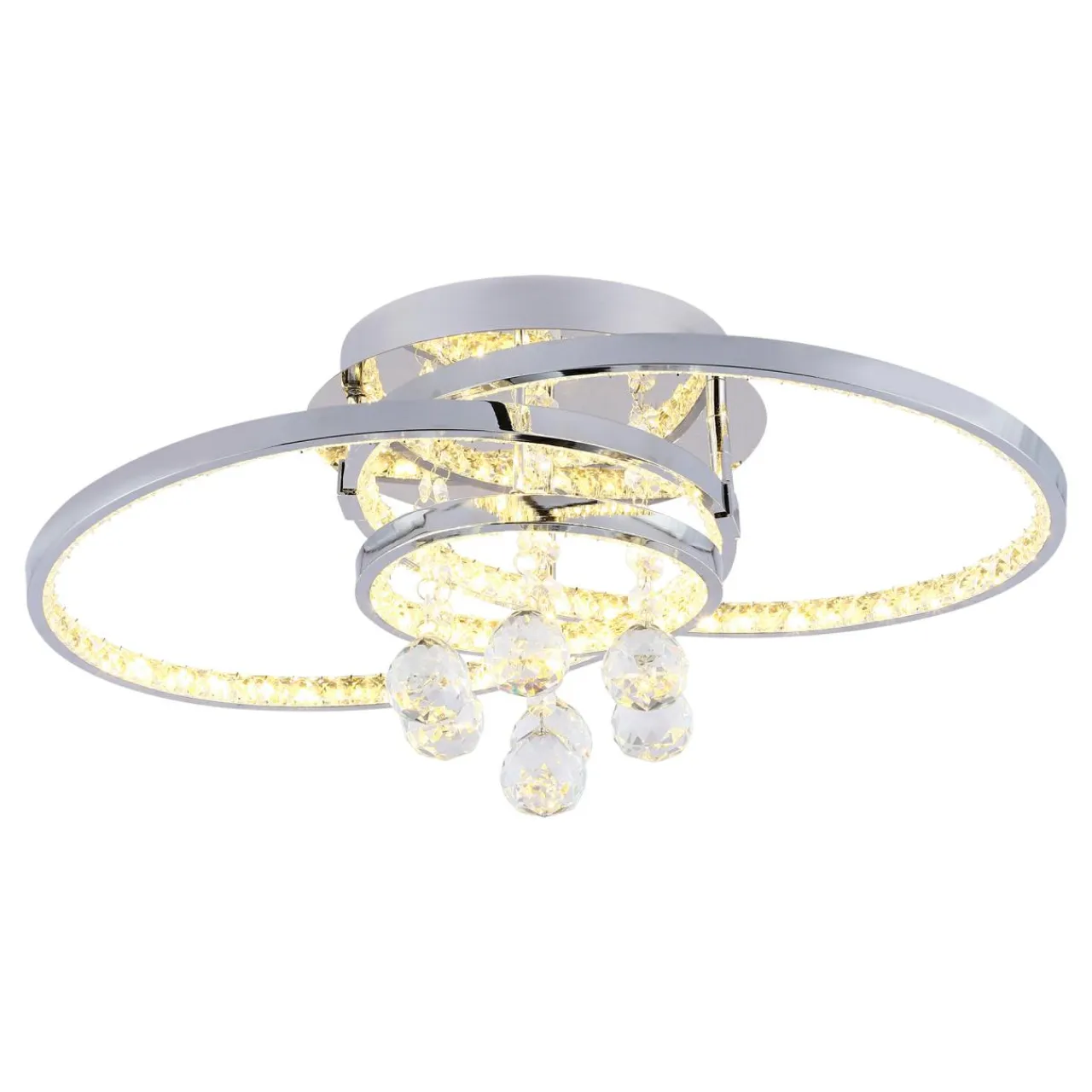 Urzeka fantazyjnym, przyjemnym dla oka kształtem bazującym na dwóch okręgach z wbudowanym oświetleniem typu LED oraz kryształowymi ozdobami z centrum misternie wykonanej konstrukcji.